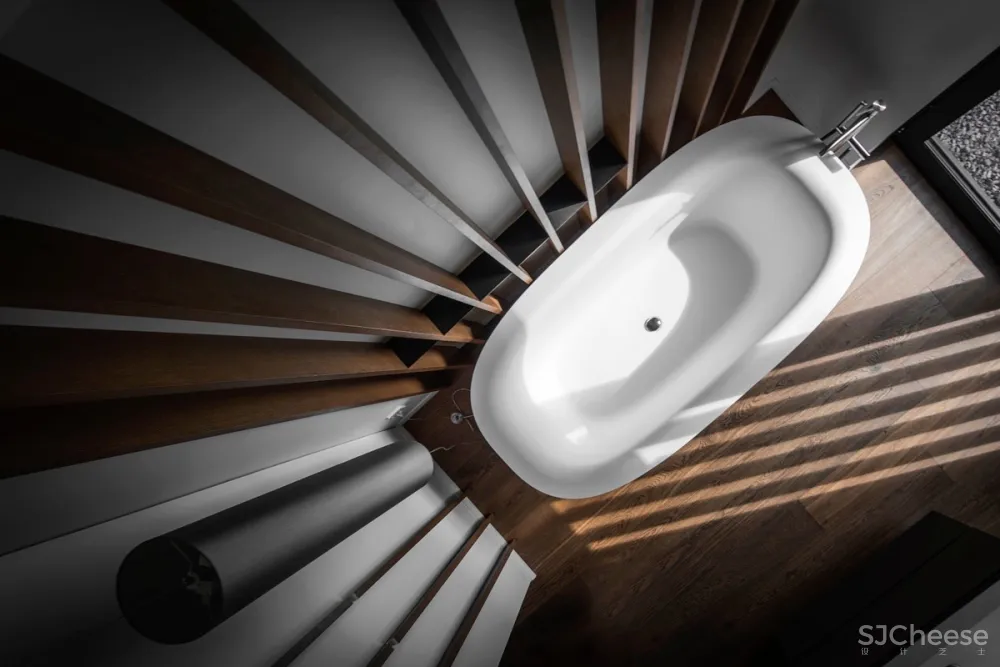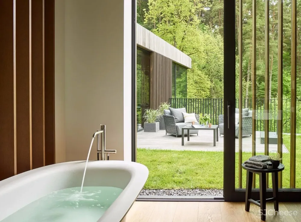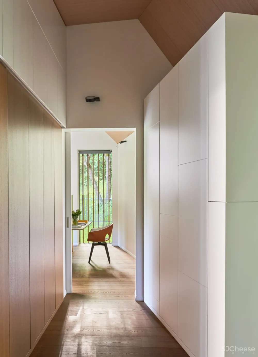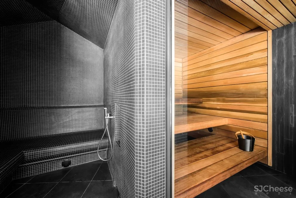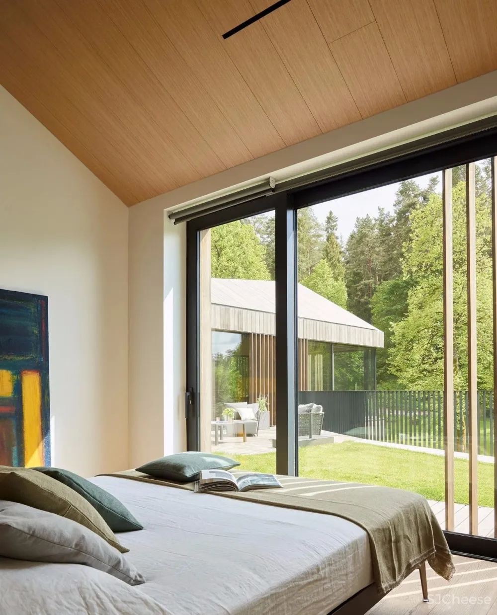 不规则倾斜屋顶,四面都是大面积落地窗,引景入室,现代和传统完美平衡。