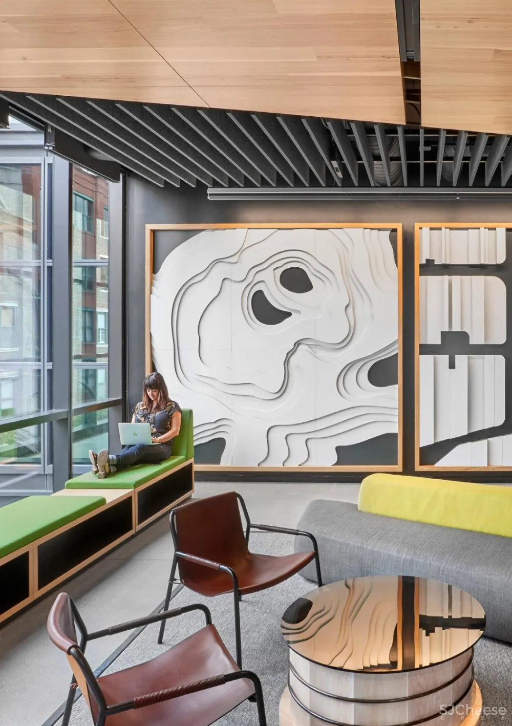 朝向电梯,种植被整合到座位区后面的墙壁中。艺术家杰西卡·斯托克霍尔德(Jessica Stockholder)的一尊完全由厨房五金制成的雕塑悬挂在沙发和椅子上方。