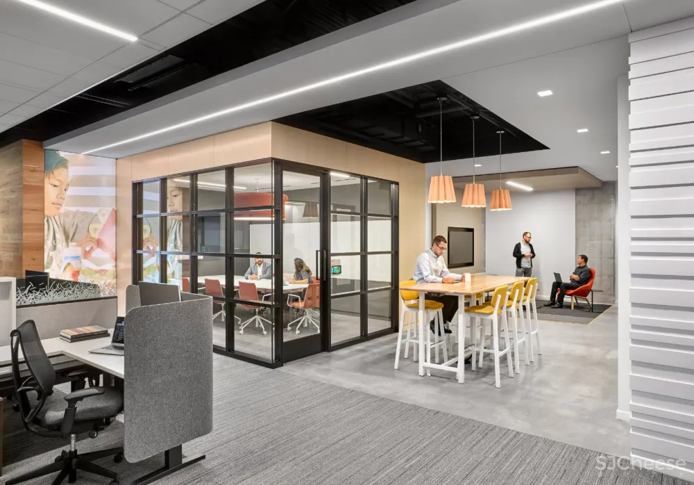 这两个设计公司把他们负责的室内区域分开。O+A设计公司负责大堂、休息室、咖啡馆和环境品牌,而IA完成了中庭楼梯、工作场所设计和测试厨房。
