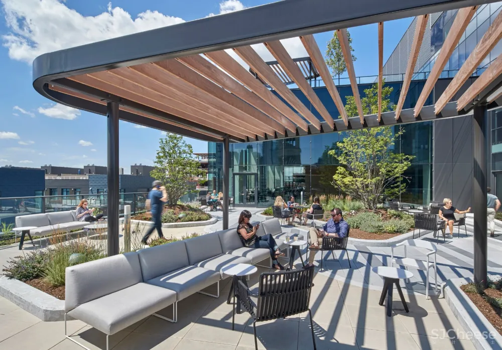 其他地方的一个自助餐厅的特色是木制的看台座位,通过双层玻璃可以欣赏窗外的景色。员工还可以利用宽敞的屋顶露台,在户外座位和遮阳凉棚下休息和放松。