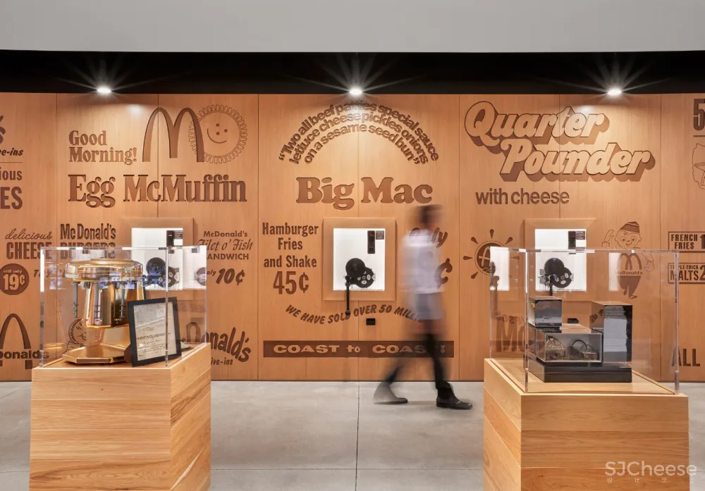一个网格屏幕上装饰着“麦当劳的创新者”的形象,他们在公司历史上做出了显著的贡献。设计元素唤起了大学的美感,比如一个类似薯条的盾牌和装满班级成员肖像的数码相框——类似于年鉴的设计手法。