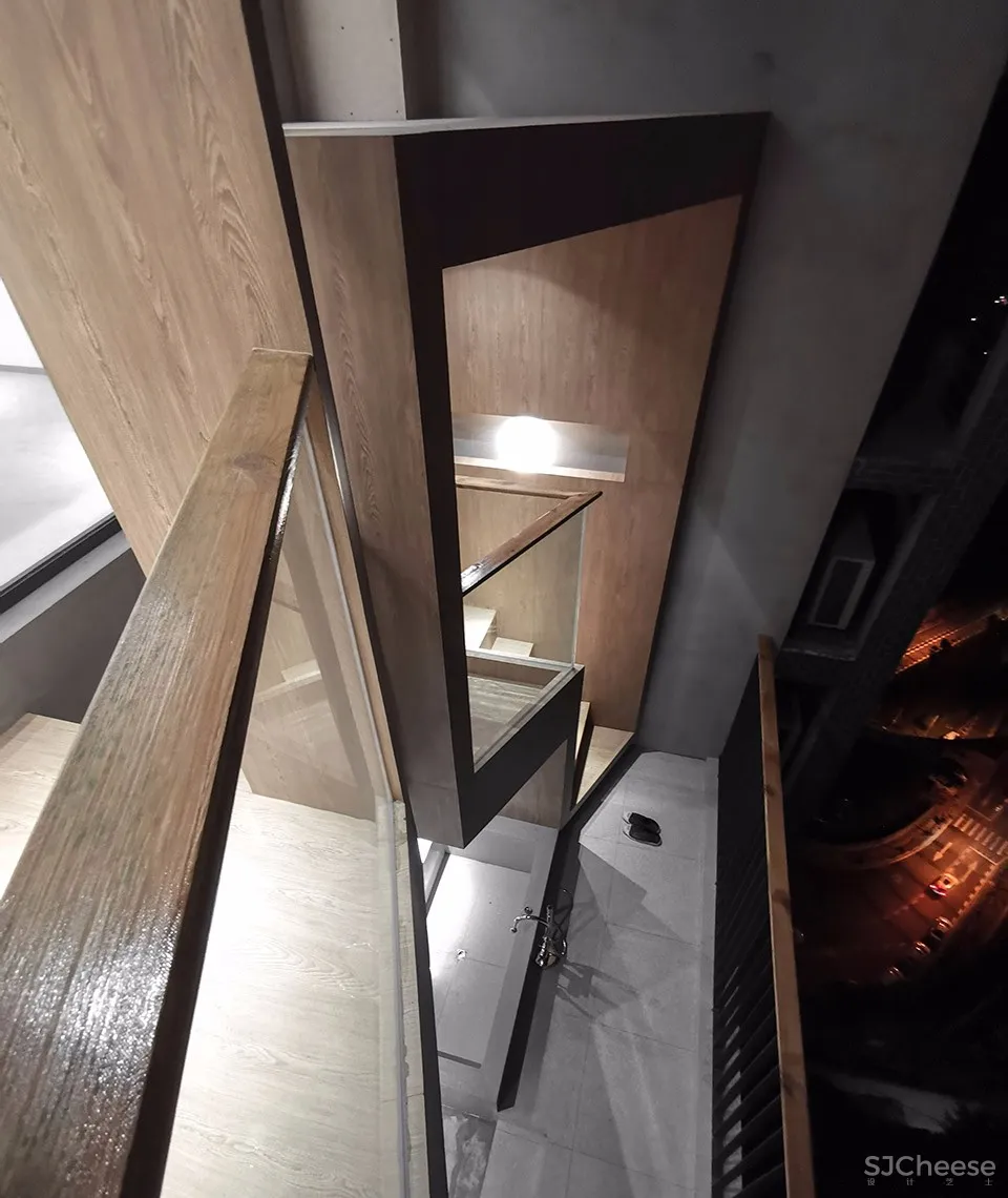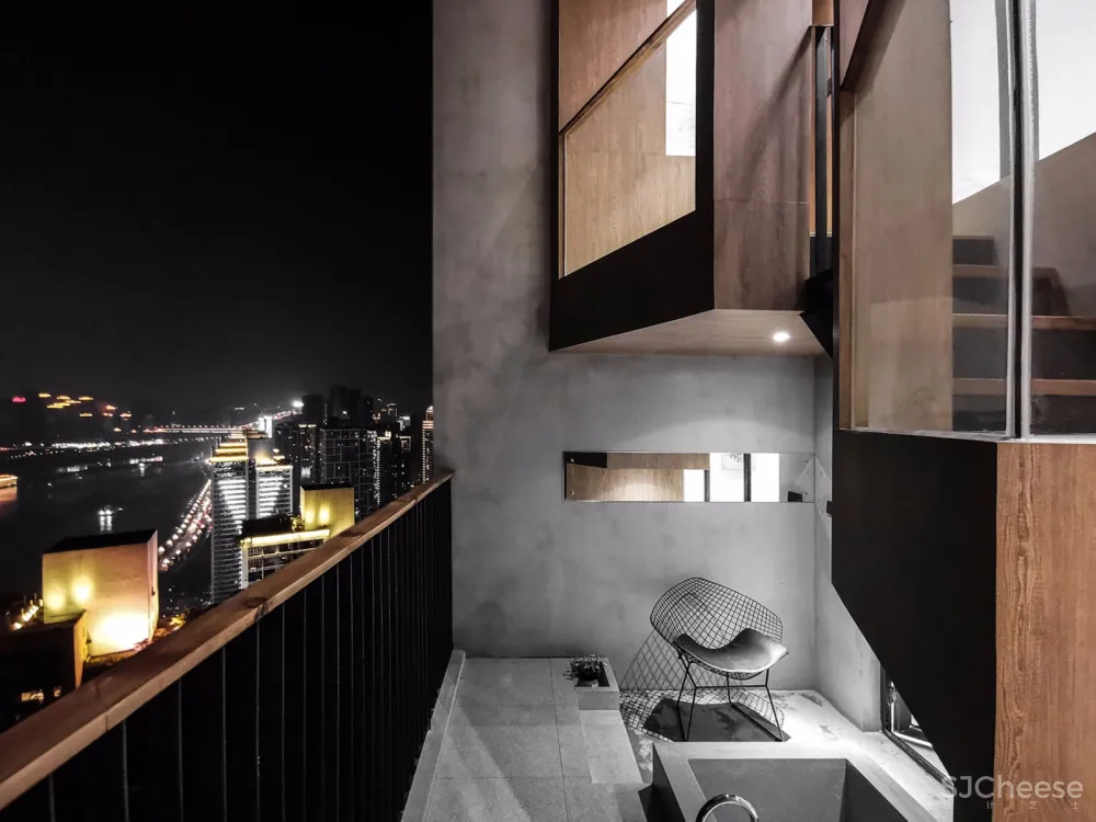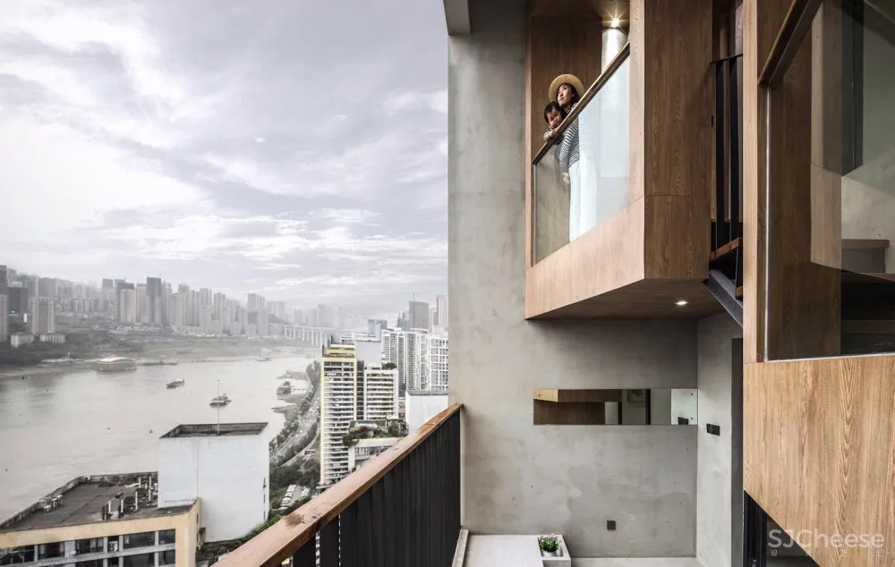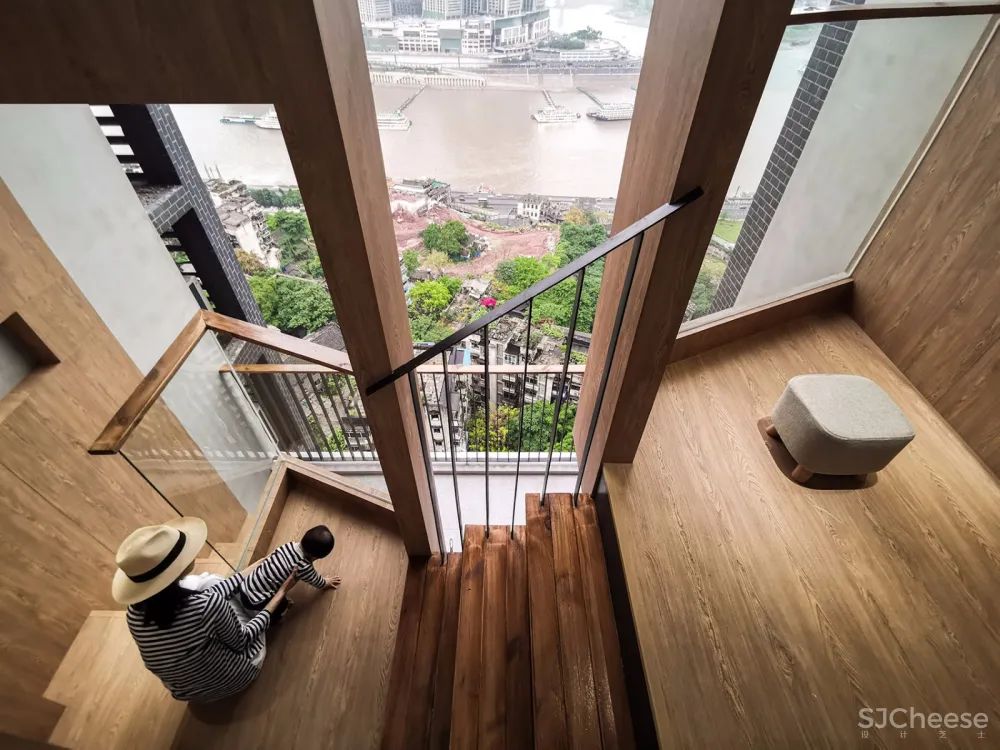 “室外楼梯的现场体验有着出乎意料的场所感:与风景的对视关系,可倚可坐的各级台阶,以及木纹温暖的触感,都让人得以诗意的停留。置身于此,便不再想跟居伊·德波辩论“观看”与“表演”的问题了,却更想向海德格尔求教一下现代化社会中的诗意栖居,或是对天地神人的守护。当一名旅客背负行囊来到重庆,沉溺于灯红酒绿的感官刺激,栖身在一个巨大人造物的第25层,其生活方式无疑脱离了淳朴而异化为征服大地、拒绝天空、远离诸神和自我流放。但这个阳台上的楼梯却可以用自己的方式将天地神人重新聚集于此:它护送着慢悠悠或急匆匆的旅客,在通达卧室的途中,获得了重新感知天空与大地的方法,这也就是在跨越他们已经习惯了的沉沦状态,无论这一过程是否被特别的思考到了。”
