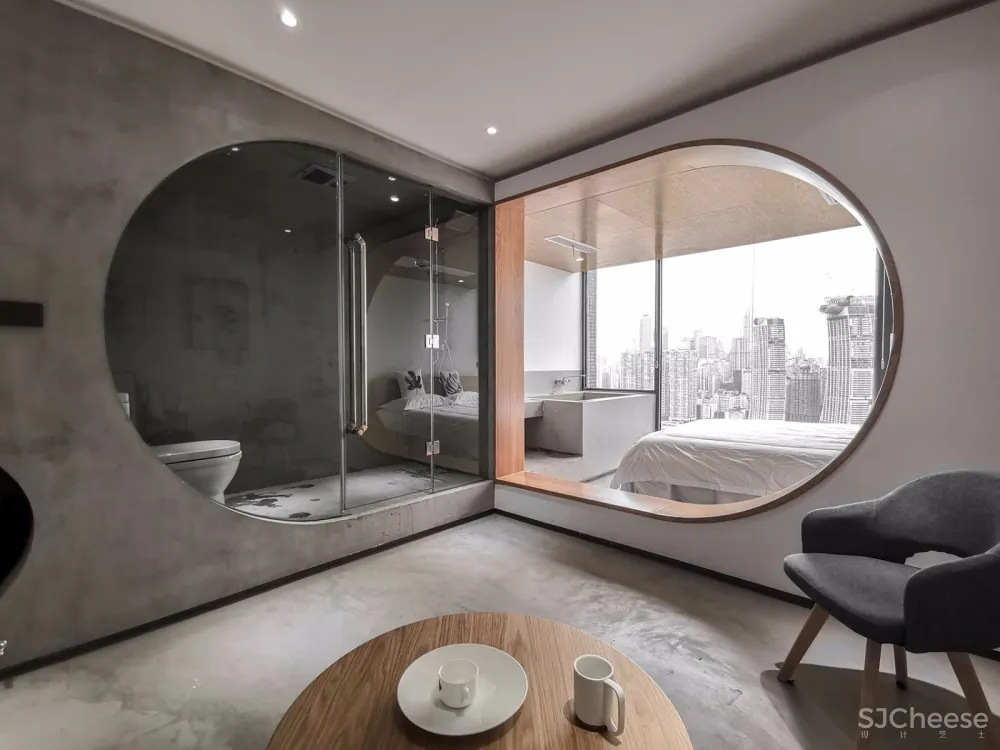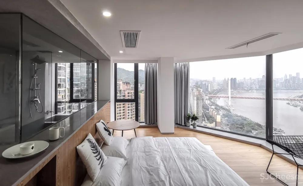 身处城市小区,决定了它很难具备精品民宿的品质;而坐拥两江盛景,又使其不甘沦为商务快捷酒店,用“网红民宿”来描述其定位十分恰当。网红经济是一个值得探讨的现象,居伊·德波曾在《景观社会》中预测了一种十分悲观的生存状态:整个社会生活显示为巨大的幻象的堆积,少数人演出,多数人被动观看,依靠幻象而活,无论是商品还是明星都是被多数人观看的幻象。但现在看来,这一趋势似乎发生了扭转,随着微信微博、直播平台的兴起,普通人的平凡生活开始变成观看对象,于是人人都可以是表演者,大家互相观看。而面对一个个网红打卡点,人们先是被戏剧化的真实所吸引,但随后就会去进行切身体验,并拿起手机化身为新的表演者,被动观看的生活状态也随之瓦解,一种新的生活常态被建立。