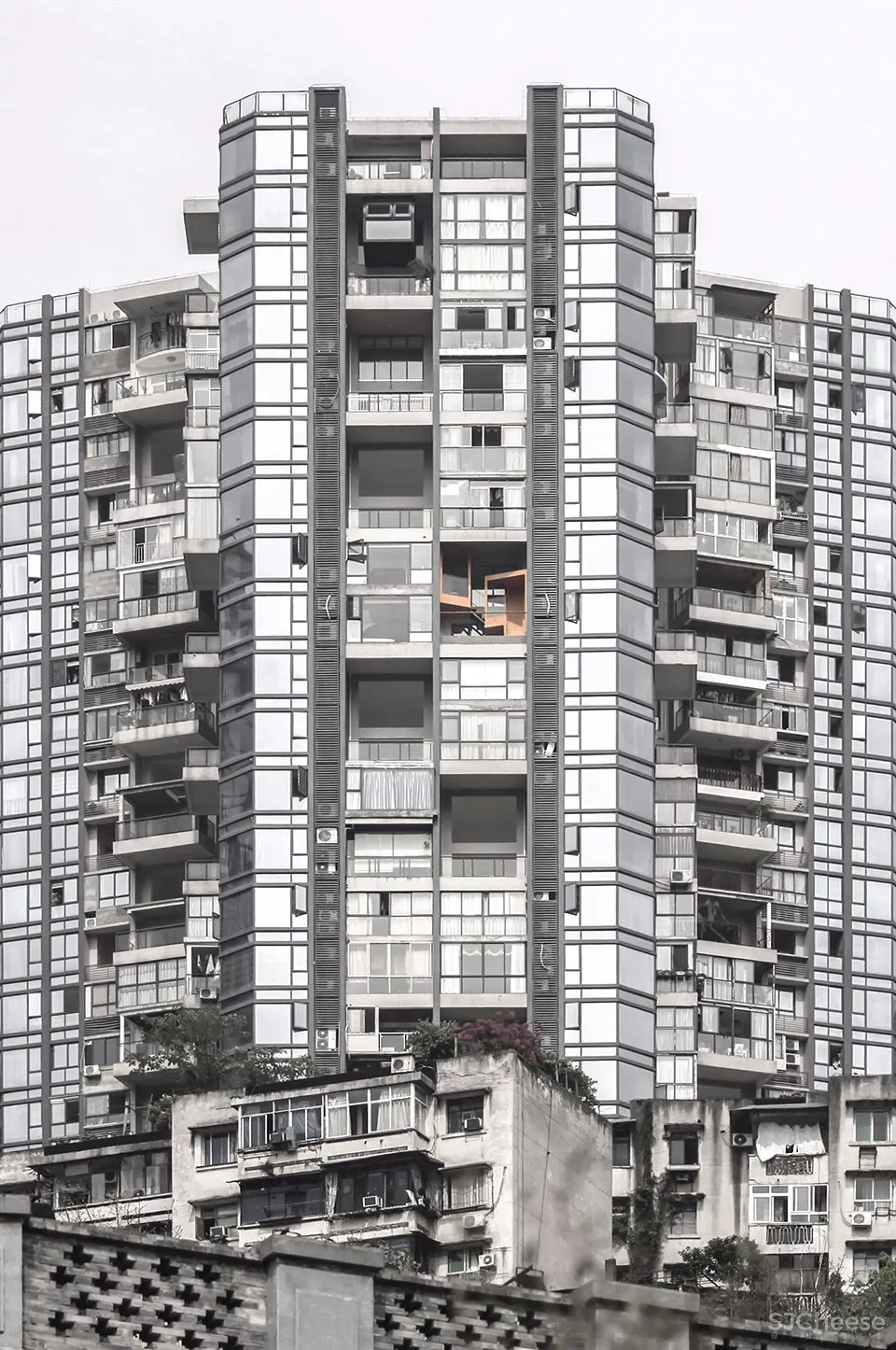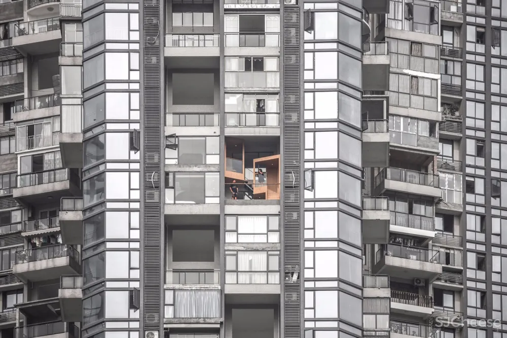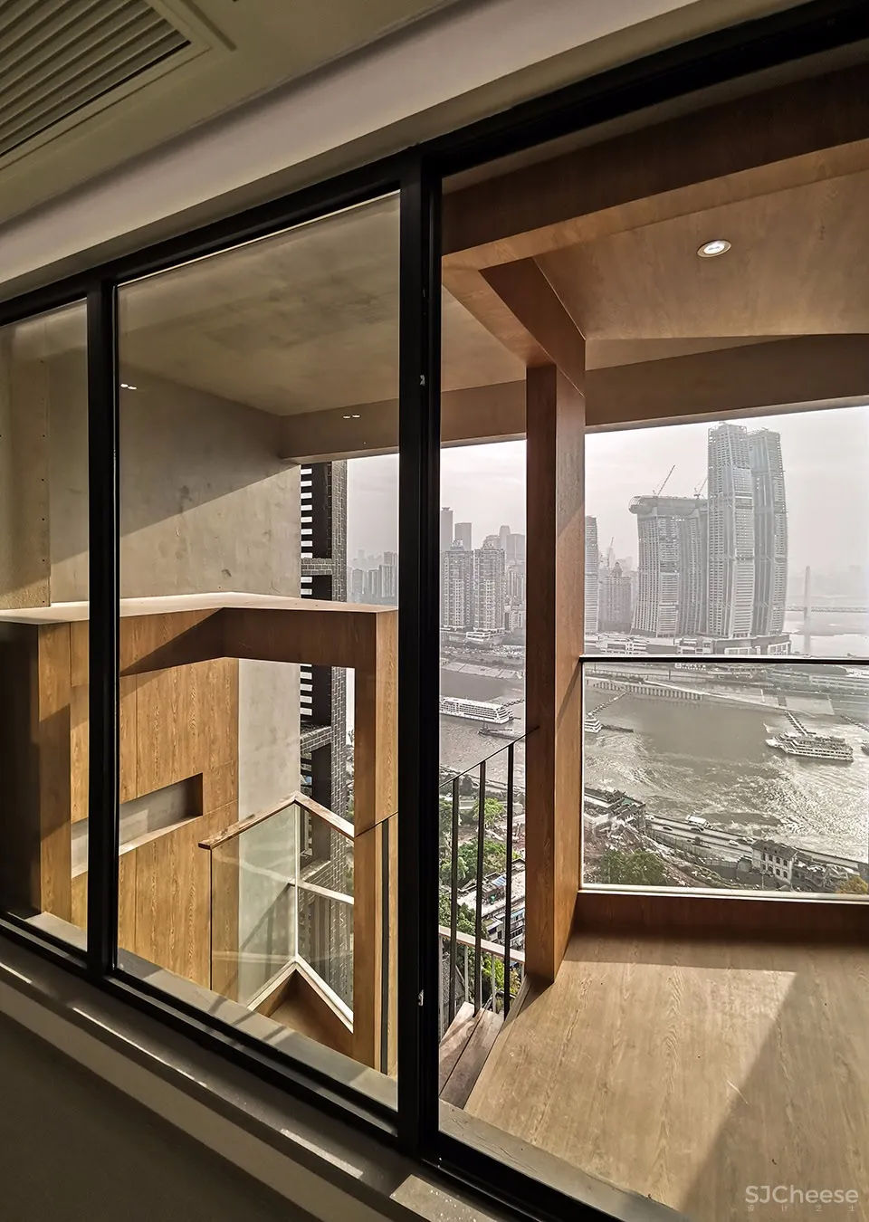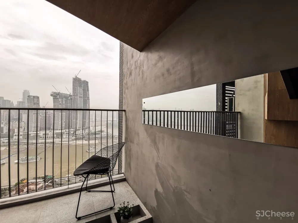 本项目位于一处临江小区的25楼,面向朝天门有极佳的观赏角度。从外部观看,小区的房间有局部跃层的处理,形成通高六米的开放式阳台,物业对建筑外立面并不加以控制,这给了住户很大的发挥空间。这里既有设计师的奇思妙想,也有住户的随心所欲:有的封闭起阳台,有的添置了夹层,有的改造成花园… 不同的结构形式、材料与色彩争奇斗艳,整个小区似乎重现了柯布西耶的阿尔及尔市OBUS规划,是一个可容纳多样化表达和二次设计的基础结构。