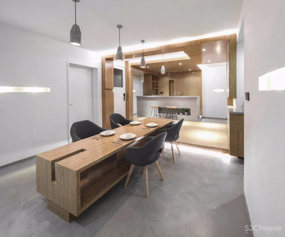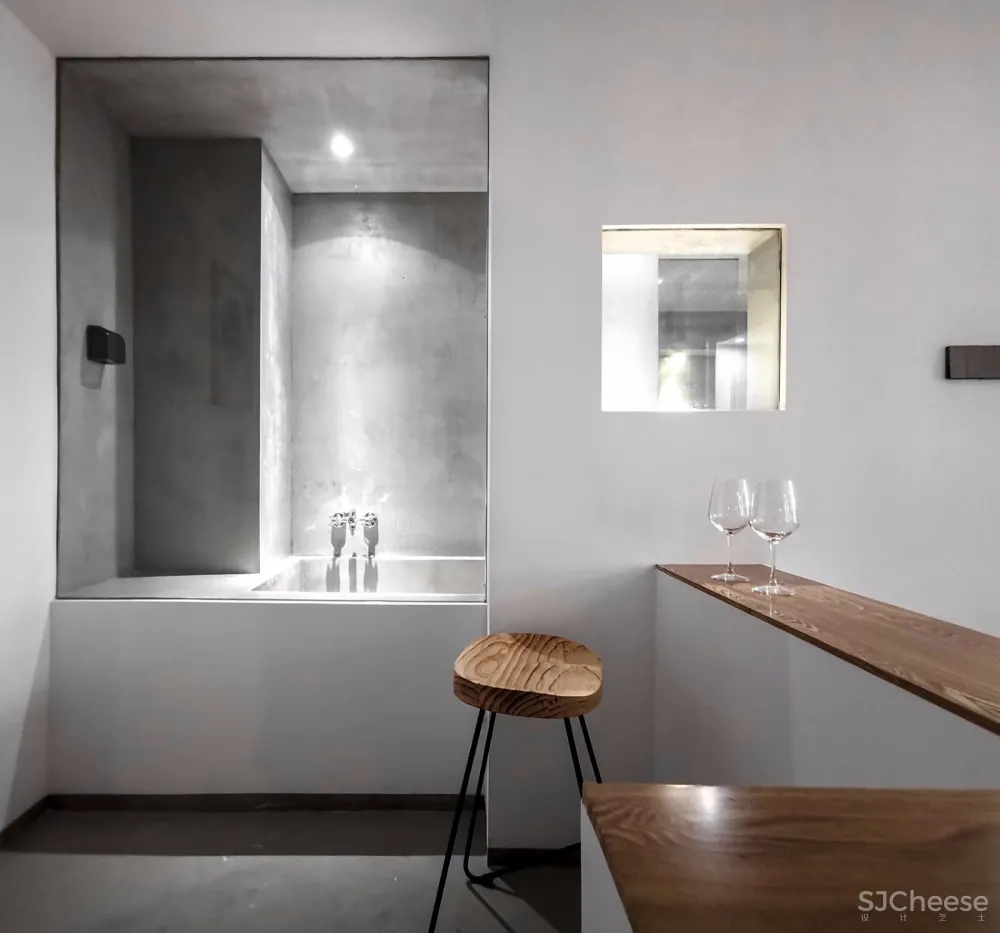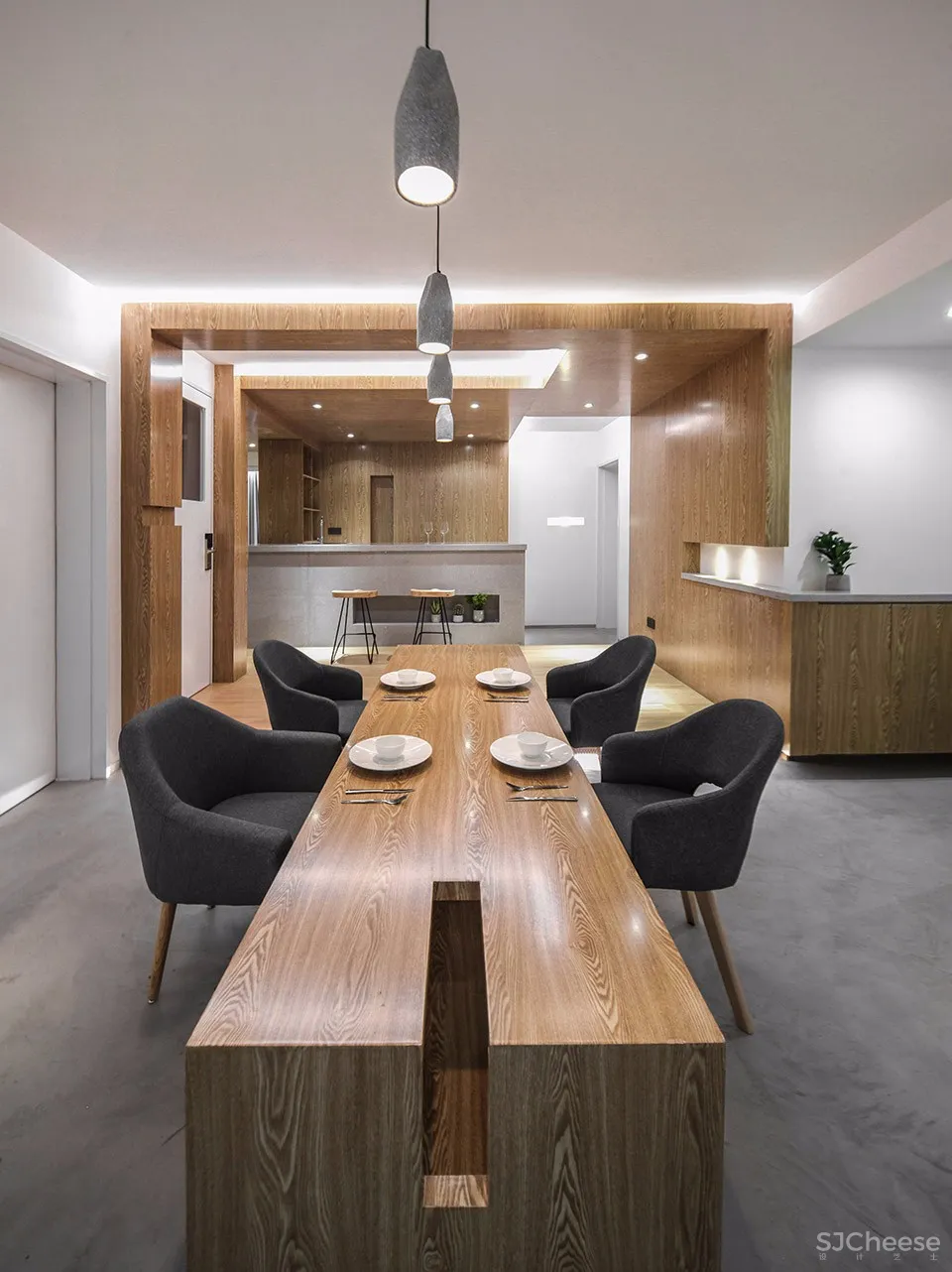 为了提升民宿的入户体验,我们选择仅保留一个入户门,将两间餐厅打通形成一个近40平米的公区,置入吧台和早餐厅的功能,并在公区正中间设置一条长桌,以避免入户后漫无目的的流线,引导住客绕场一周后再进入自己的房间,以期能够在尺寸间创造出节奏上的变化。