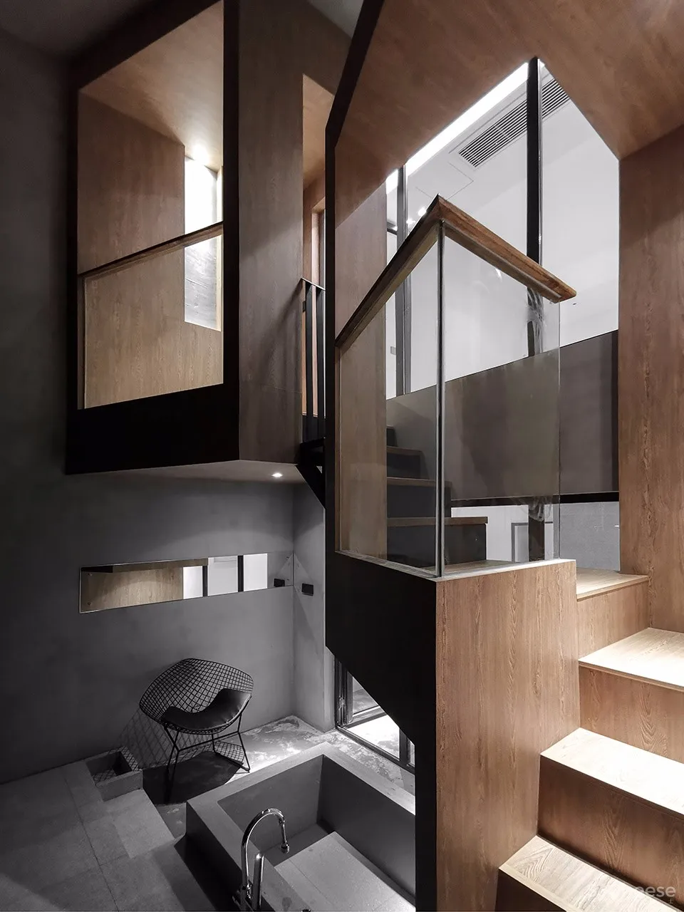 于是我们将通往跃层二楼(客房卧室)的楼梯置于阳台之上,配合对岸的景观将休息平台设计成两个取景框,提供不同角度和姿势的观景选择,并期待在此发生不同的桥段与情节,为住客提供在网络上化身为表演者的舞台。