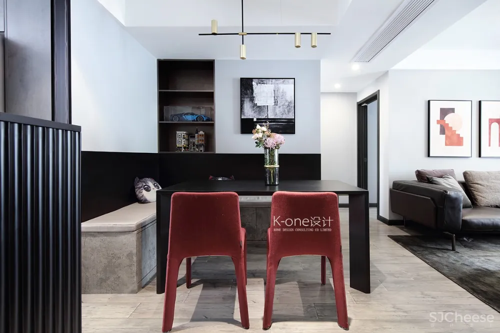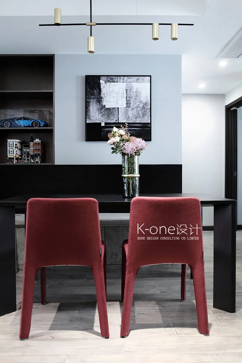 墙上红色的艺术挂画让人眼前一亮,明显可以感觉到设计师照顾到了餐厅处的色调,相互呼应、彼此点缀,为灰色的空间赋予了灵魂。