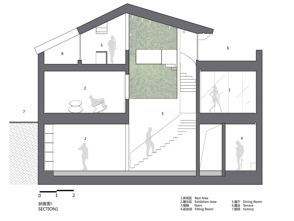 由于各种历史原因,北京旧城区除了分布着四合院、大杂院之外,还混杂了一些单体建筑,这个项目就是对某处小型单体建筑进行的改造。原本平屋顶的房子被处理成坡屋顶建筑样式,缩小房屋体量以使其融入到胡同街区之中。房屋的使用功能设定为买手店,可以容纳展览、物品销售、轻餐甚至场地租赁等多种活动的使用。