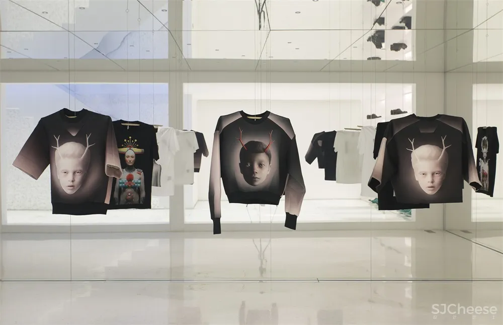 地下一层被改造为服装、鞋帽的展示和售卖区。发光地面作为鞋帽、产品的展台,同时补足地下空间的光。精选的服装悬挂于一个镜面空间之中,人与物产生有趣的关联。室内照明全部采用智能控制,镜面空间内嵌可变色的灯光,可以满足不同活动、场景的使用要求。