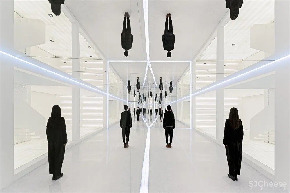 The basement was repurposed into an area for displaying and selling garment, shoes and hats. The gleaming floor serves as the display stand for hats, shoes and other items, and also brightens the underground space. Well-selected clothes are hung in a mirror-filled space, which produces playful interaction between people and objects. The design team adopted an intelligent lighting system in the entire space, and embedded variable lights into mirror-clad spaces, with a view to meeting the needs for different activities and settings.