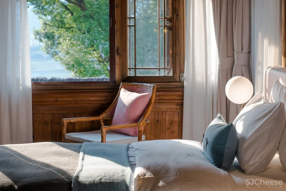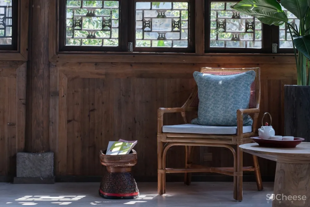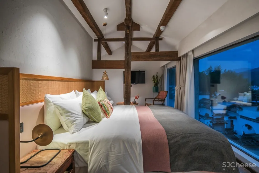 “青山绿水引诗赋,墨瓦白墙牵画魂。”以窗框为画框敞其观户外四季变换中的水墨宏村奇景,在不破坏建筑外观的同时设计保留旧窗格元素对原窗进行扩宽及重设。室内保留部分老木质材料及裸露粗犷的木结构,让人感受岁月在其身上流逝的痕迹。