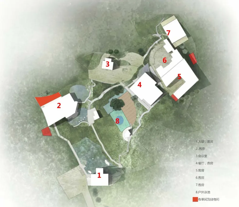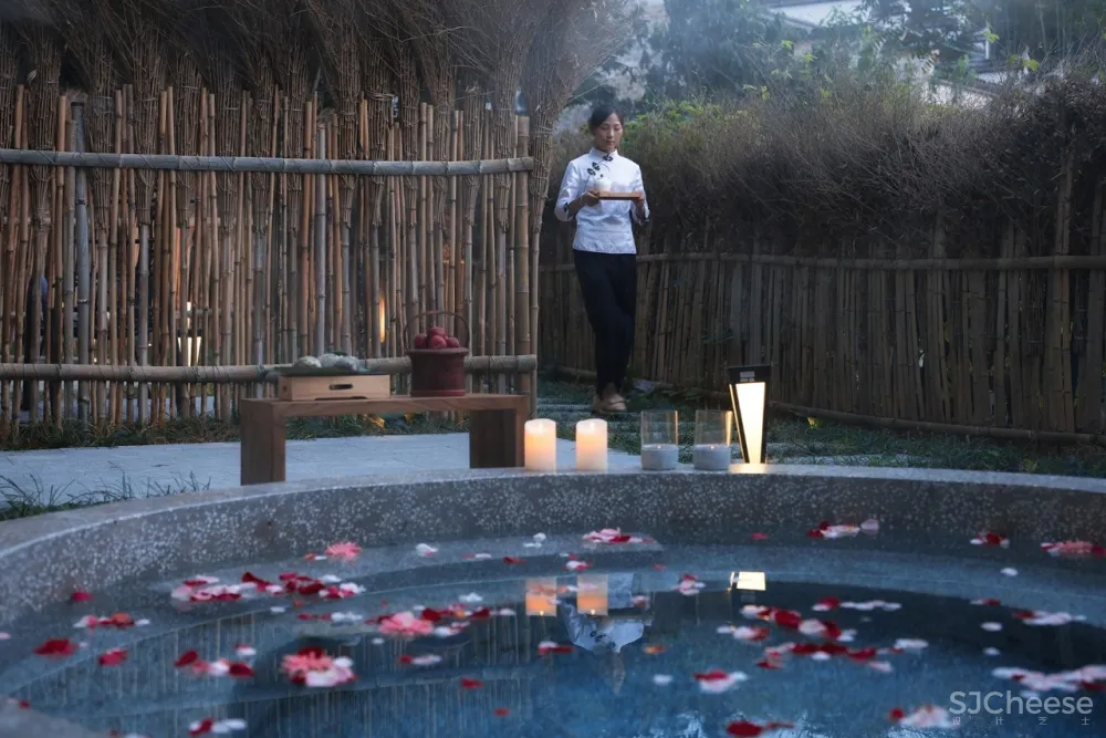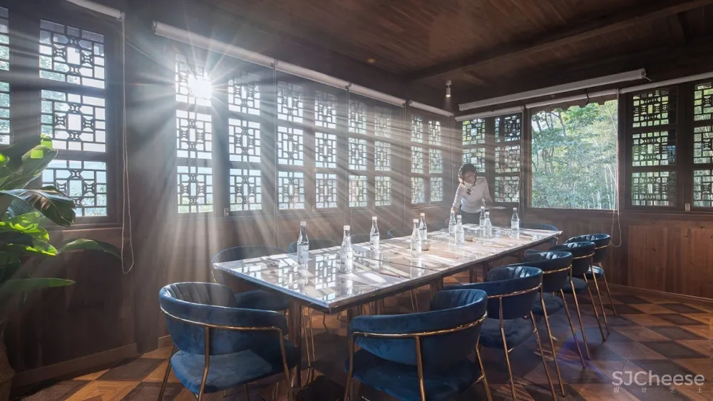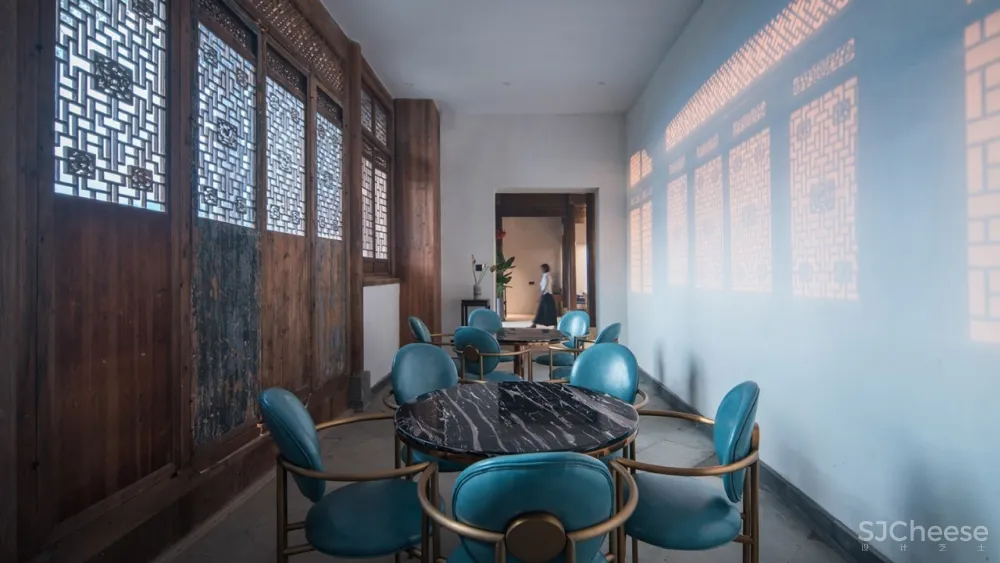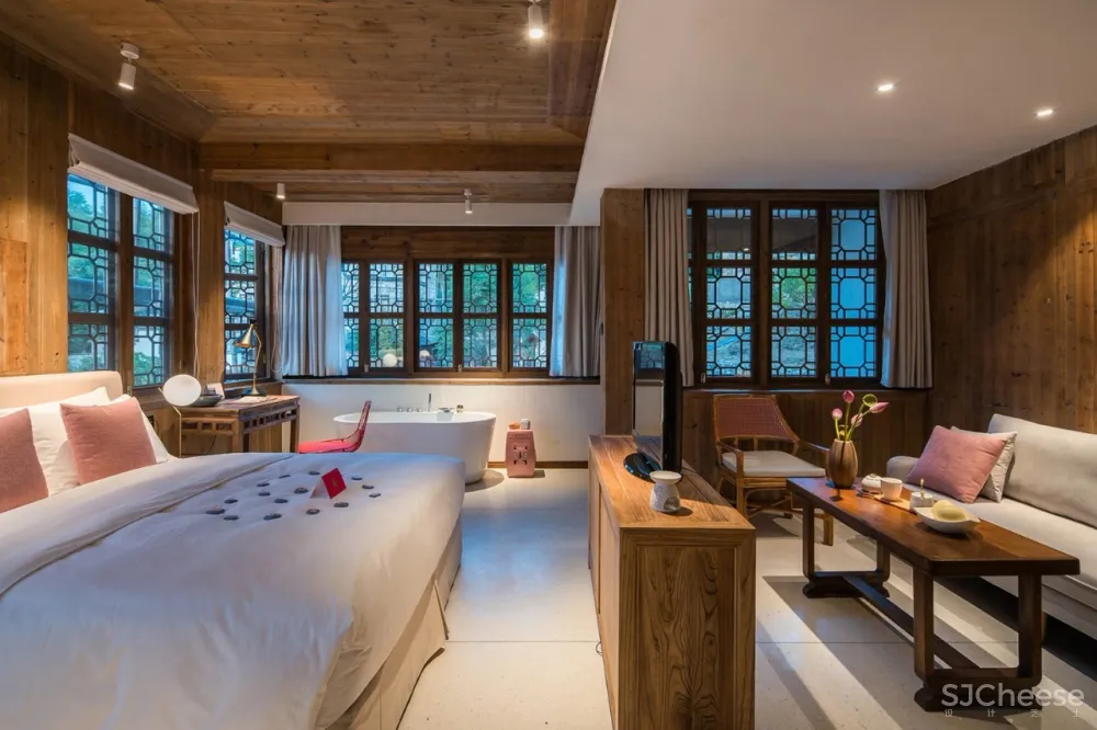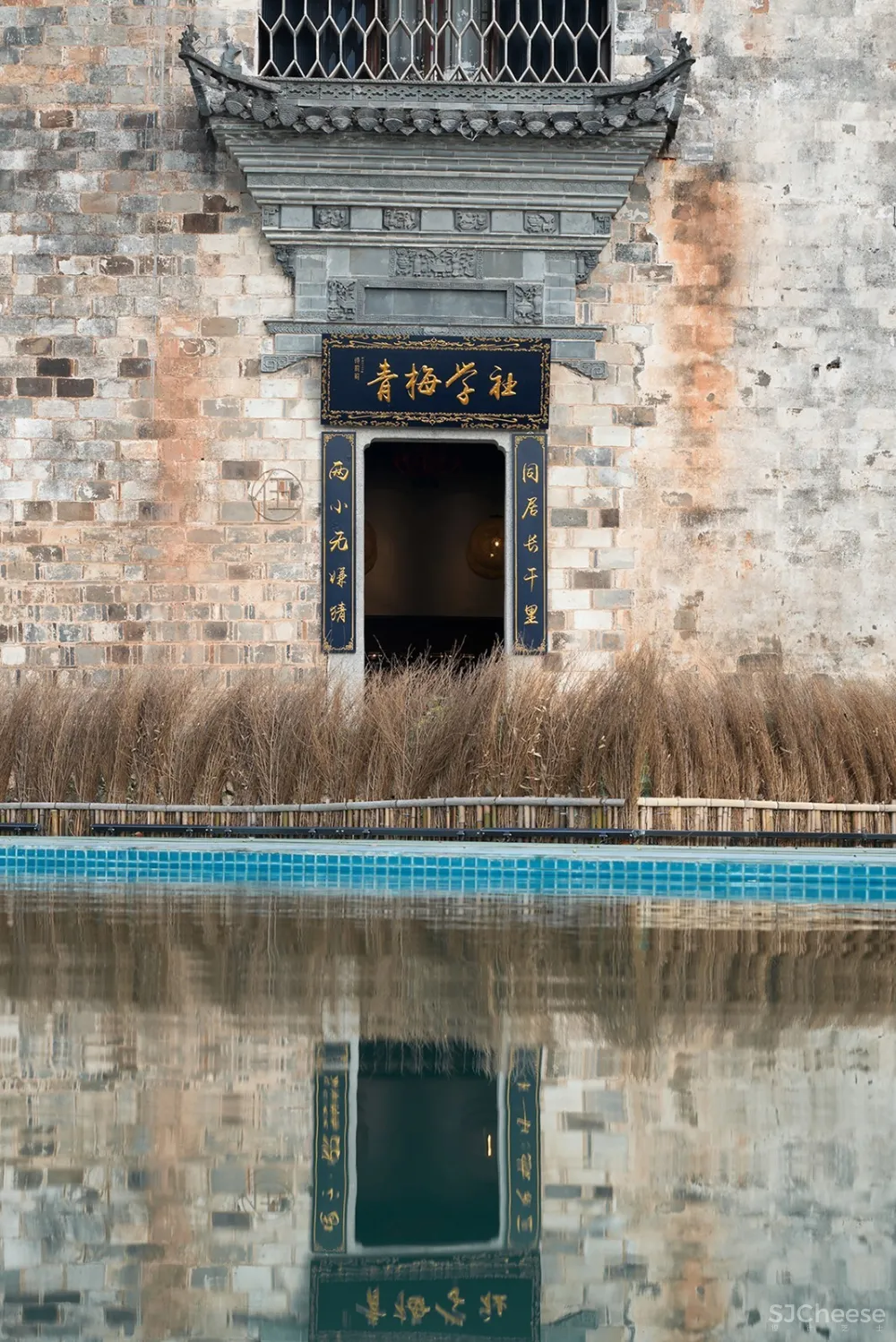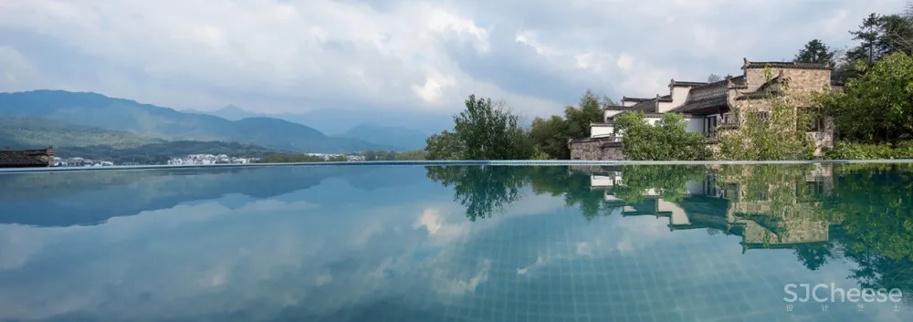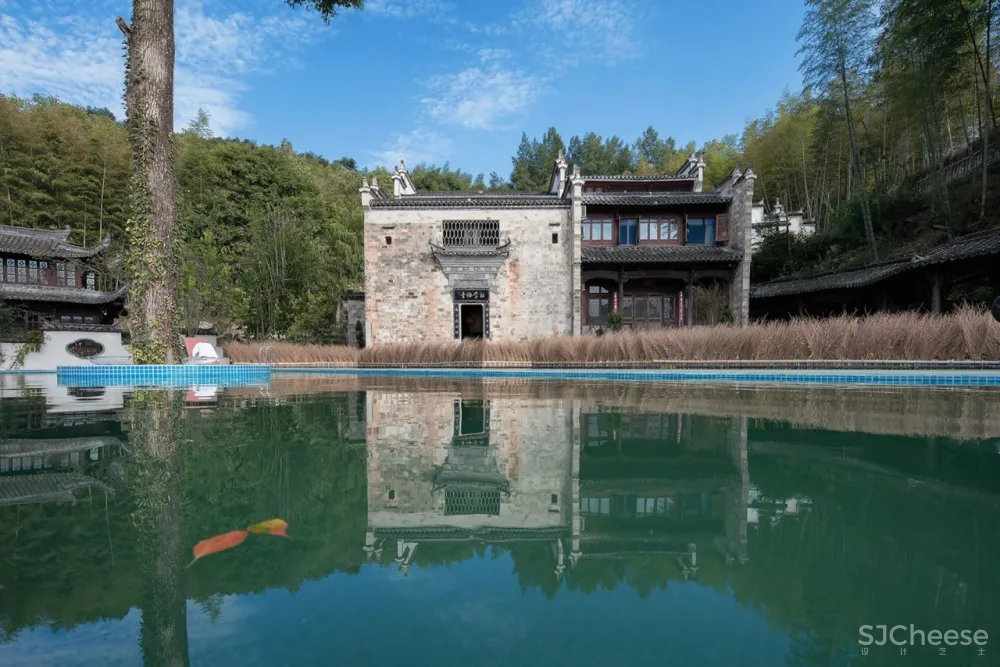 酒店由七栋不同时期建造的徽派建筑组成。建筑实施保护性修复,做到修旧如旧并保持徽派建筑独有的砖雕、石雕、木雕来做装饰。利用地理优势将山间小溪引流,经过酒店每栋建筑最终汇聚堂前形成一波清池。