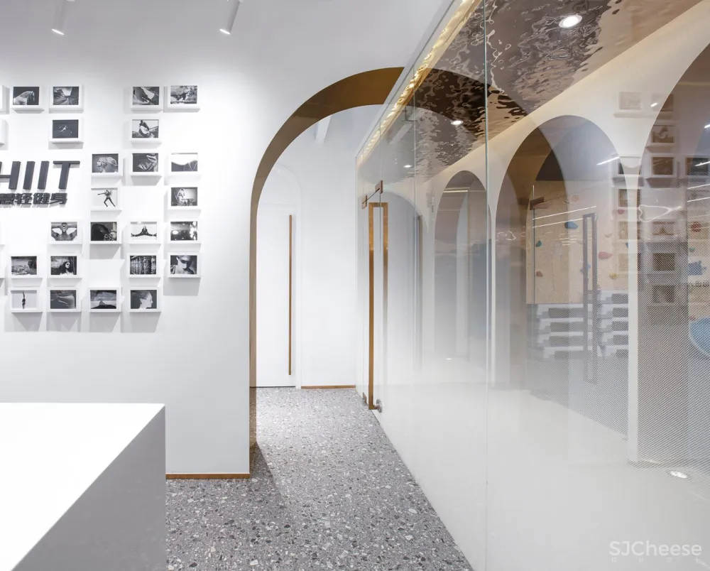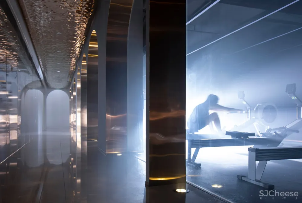 从入口进入空间,我们布局了两个大的动静空间分区。动静分区以两层玻璃隔断将一条公共走道一分为二,这是一条仪式感极强的走道,作为线性空间,它也是整个空间的主轴线,由此可以进入水吧区、休闲区、课室、更衣间、体测室、操房以及VIP室。通透而不失私密性的全开放式空间,所有会员的运动场景在休闲洽谈区一览无余。