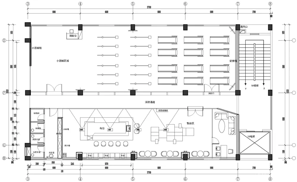 所以,空间坪效亦是AIMO HIIT的重要核心组成部分,当故事空间设计公司接手这样的项目,面临着不仅仅是一个概念方案这么简单,其实设计师要做的是一个空间品类的研发。在充分理解了AIMO HIIT训练中心的新零售商业模式后,在功能面积配比上,我们做了相应的改良优化。