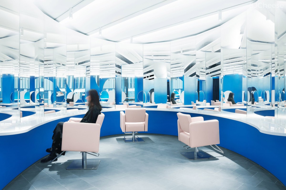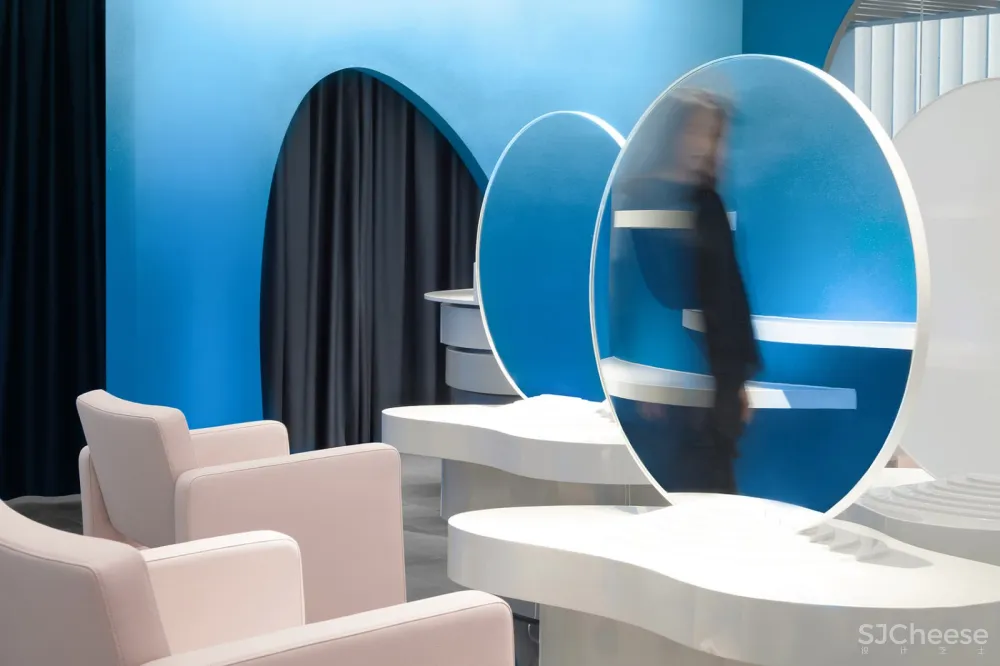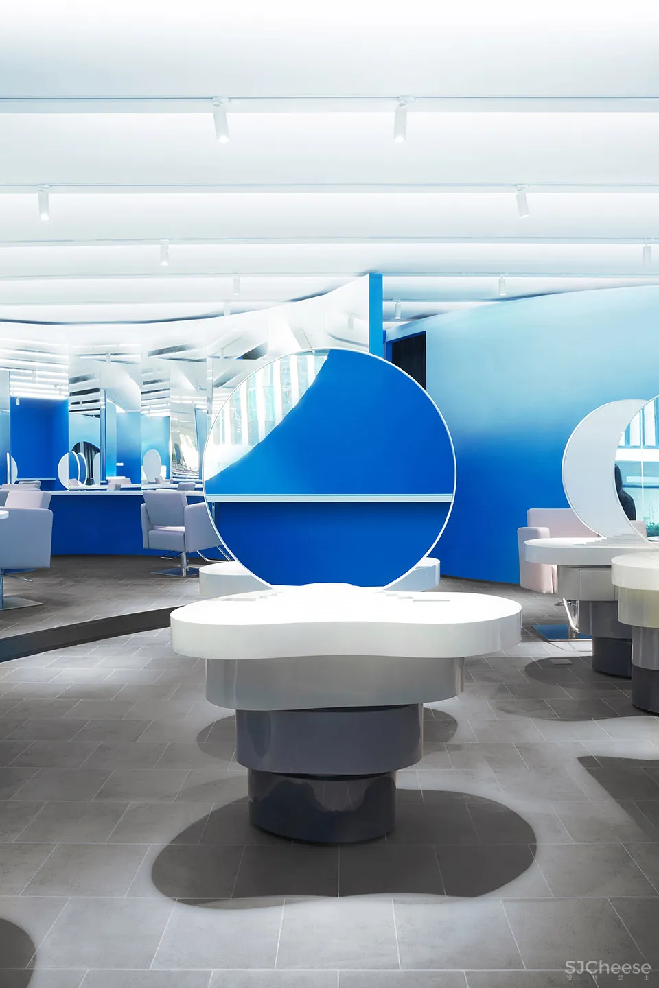 美容院室内具有柔和的弧形墙面,覆以蓝白的渐变效果,身处其中,仿佛置身于海雾和海浪之中。这些弧形墙面将整个空间以流畅的方式连接起来,并在确保空间开放性的前提下,将美容院空间分成了不同的区域,以便在小区域内进行各种服务和活动。