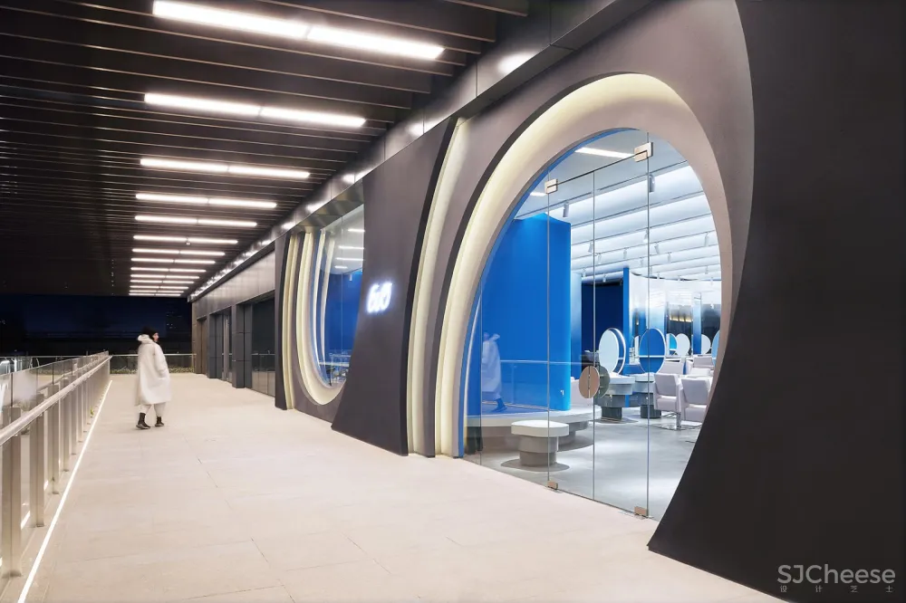 ▼透过弧形墙面上的弧形洞口看美容院中心的沙龙区