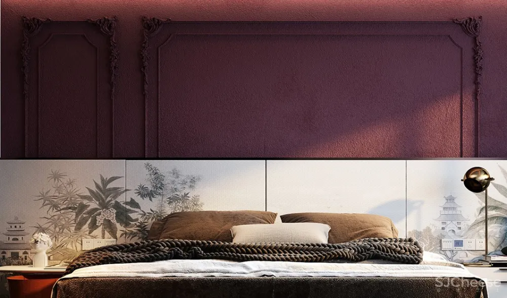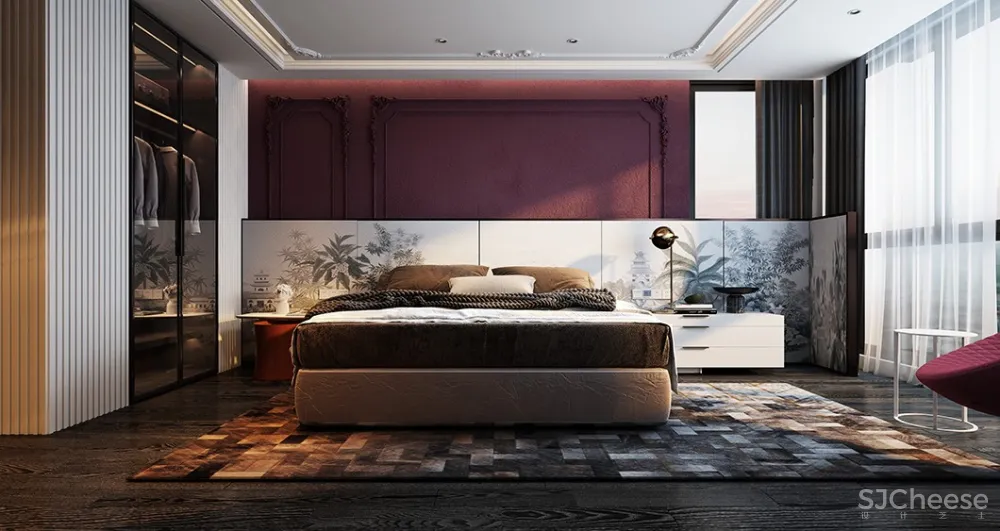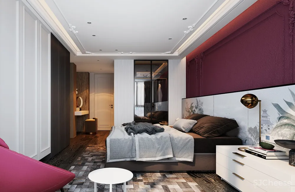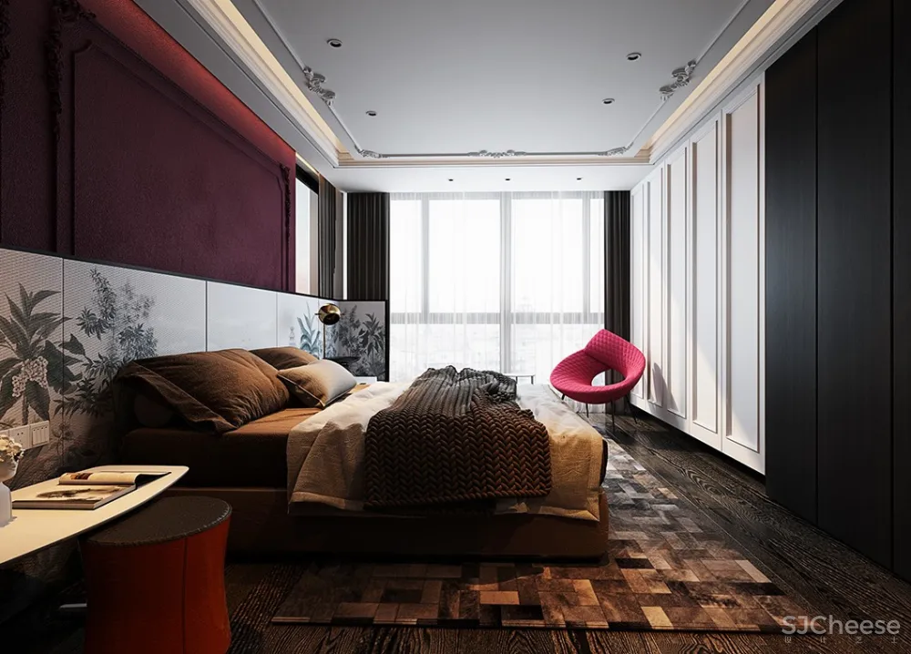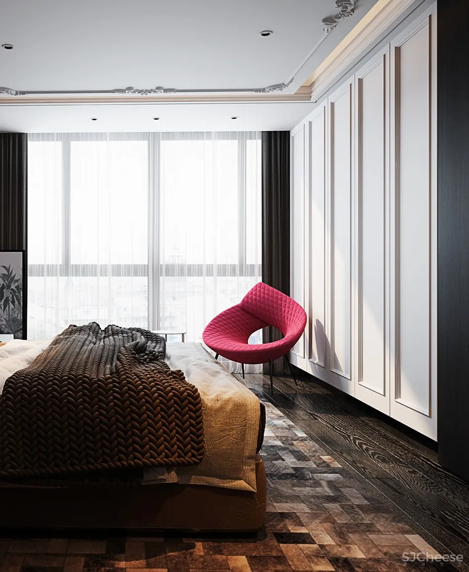 主卧素雅风的基础加以纯粹时尚的玫瑰红,有意降低的复古壁画屏风,规避了床头窗扇的潜在不安,通透而均衡。动人的往往不是奢华,也不是奇异,而是精细的体验与美感。
