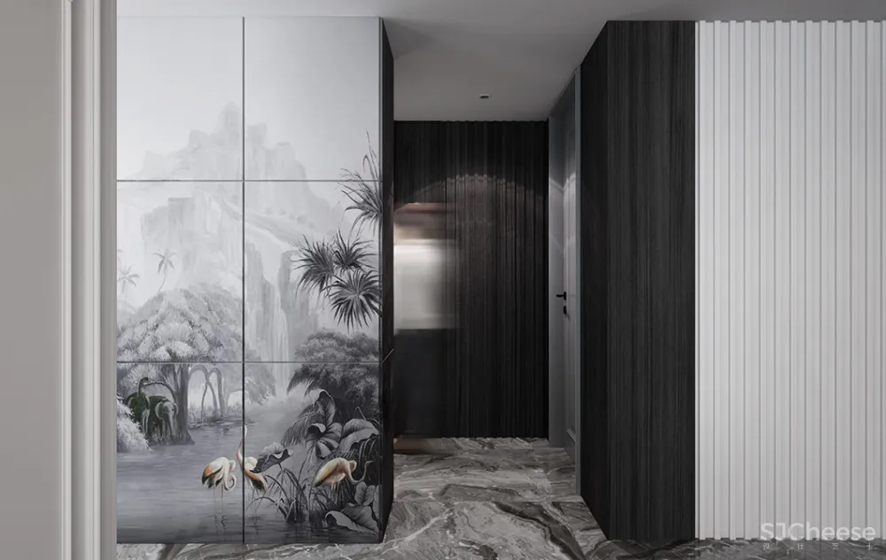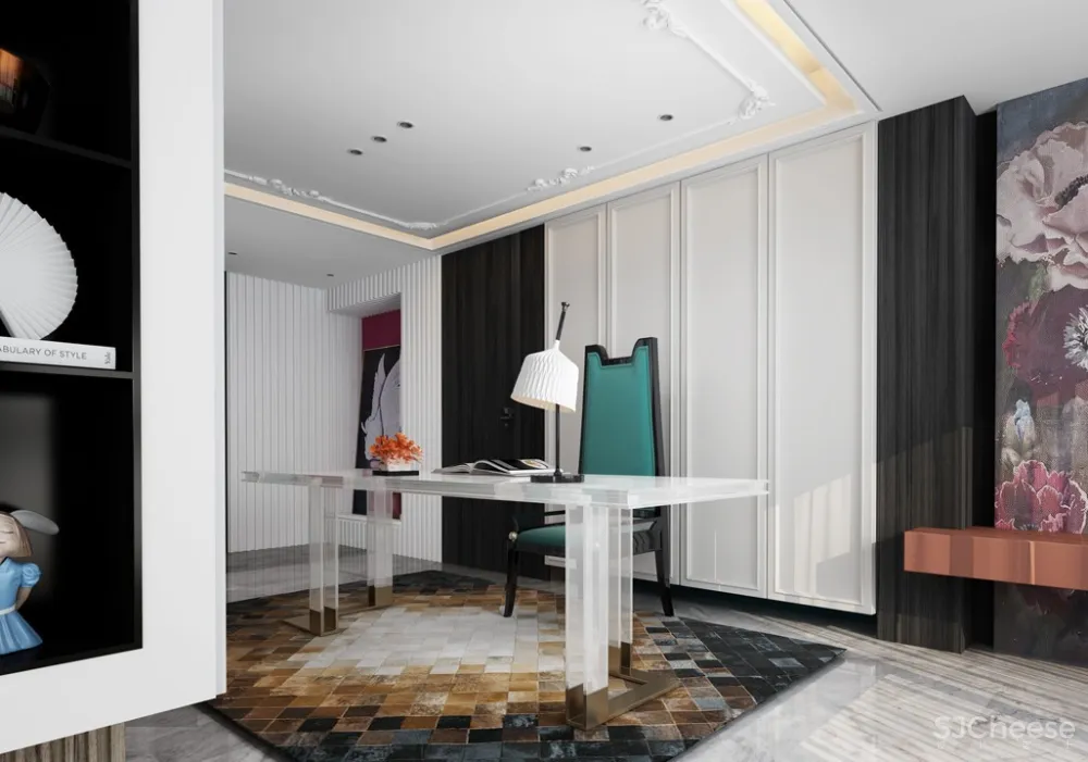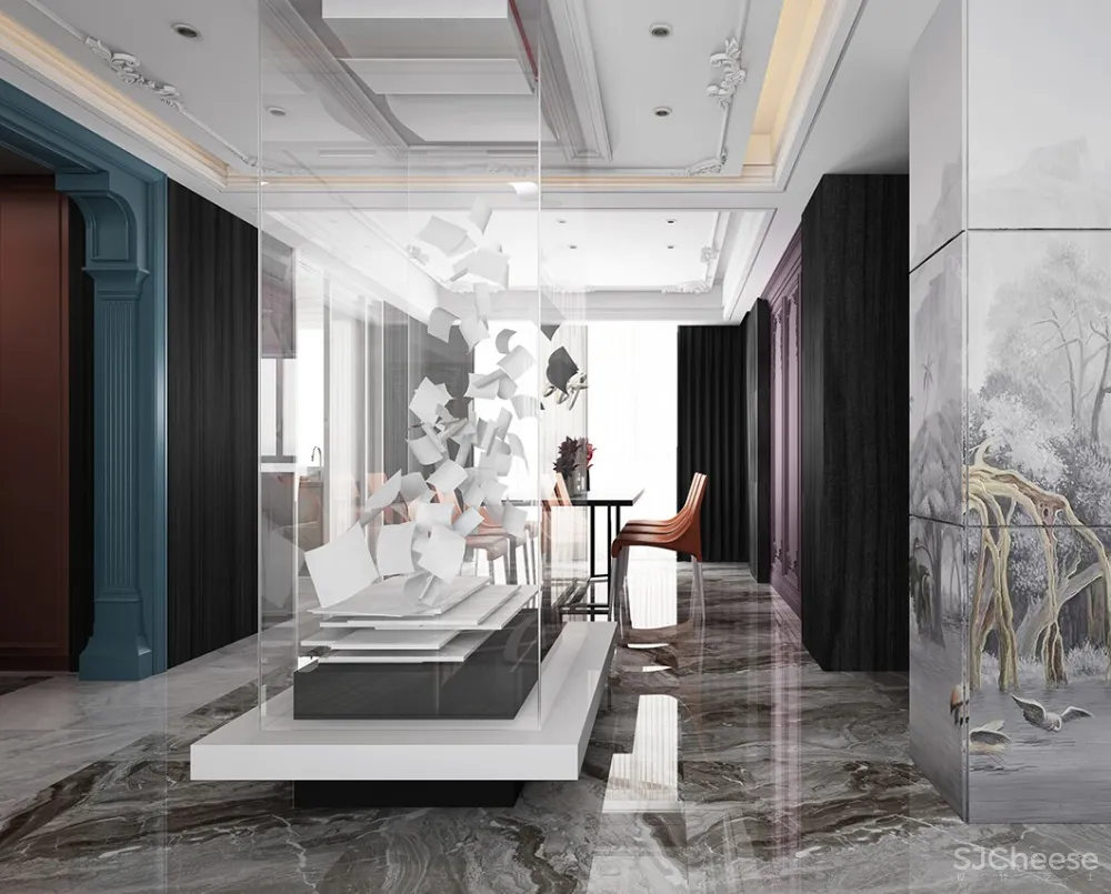 我们一直强调空间应该服务于使用者。塑造一个空间,即是品读一个人。设计师巧妙地运用玻璃、石材、以及量身定制的原创雕塑,创造出时尚轻奢、又具优雅魔力的玻璃玄关,让它成为整个空间的点睛之笔,把主人“要和书一起”的生活理念体现无疑。
