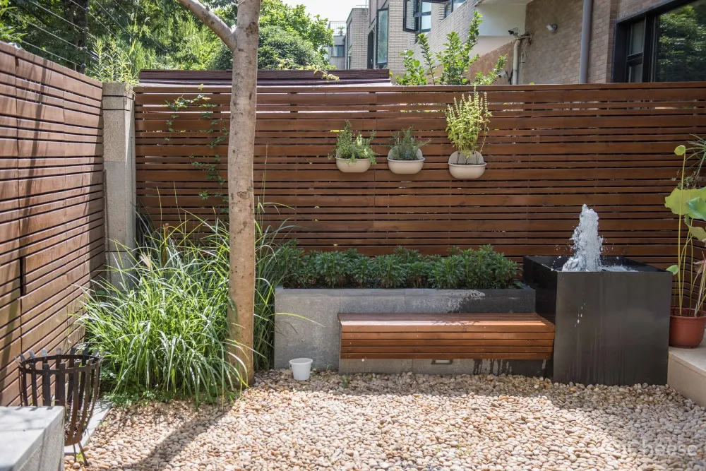 室内外的先接部分做到了延伸室内的平台,周围的围挡采用木质格栅和磨砂玻璃的组合,过滤周围建筑的视线分隔,保证周边的视线互不干扰。室内外我们增加落地玻璃窗带来充沛光线,将庭院里美好的四季变化轻松地引入室内。达到室内外各个公共区域之间的界限消隐。