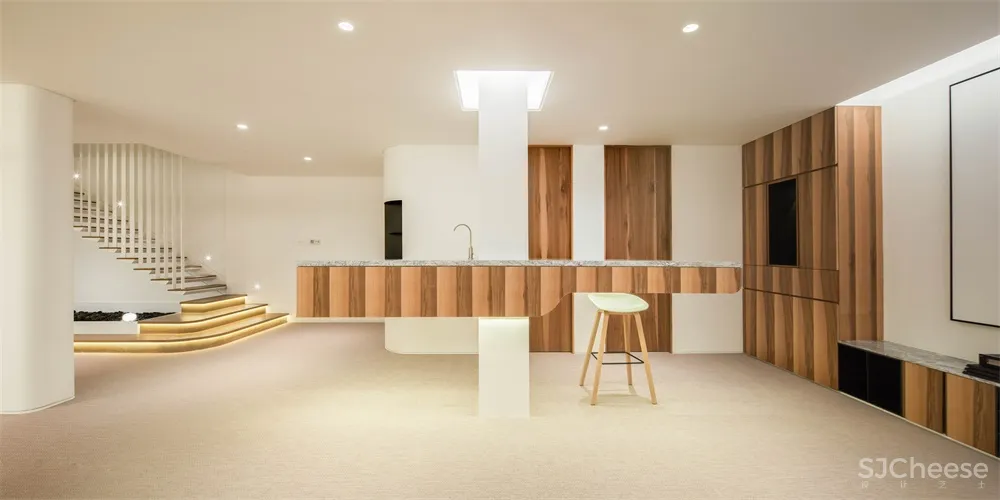 在二层与三层,考虑到家庭成员之间的不同需求,我们增加了公共区域的趣味性。综合考虑到老人和儿童的安全性,二层的走道区域的墙体做了倒弧处理,墙面嵌入感应灯保证夜间的安全。设置开敞的中岛台,让二层的生活也变得很便利。