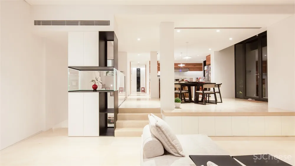 The overall color of the room appears as white tone. With the stairs and increased size of the patio, we enhance the layers between spaces to create diversity and enjoyment. Transparencies are introduced into the family’s public activity area, increasing the convergence of family members’ independent spatial scope.