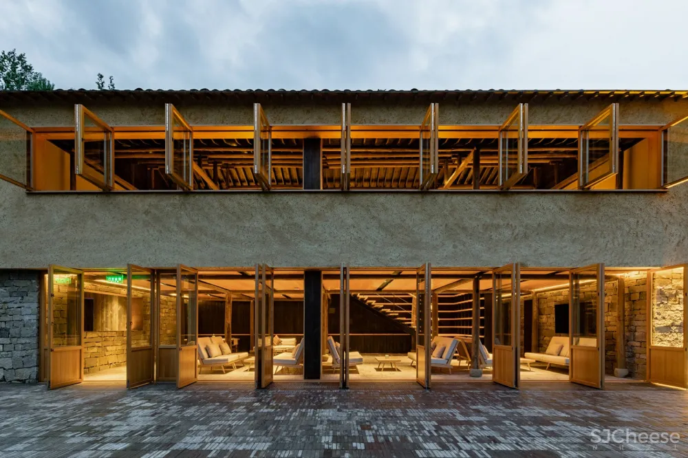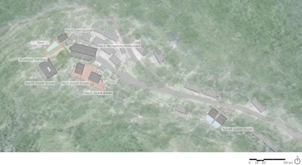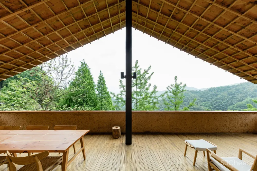 作为散落在村落中的民宿酒店,建筑语言理应要与周围村民家的景观相呼应。当地民房大多采用夯土墙,但被传统土墙包围的空间会有闭塞感,也无法从室内感受到周围美丽的景观。如果只使用保守的手法重建夯土墙形成的村落,也许就无法吸引游客了。如何平衡丰富的自然环境(开阔的视野)和呼应周边既有村落(封闭的土墙)这两个矛盾的条件,便是这次的设计课题了。