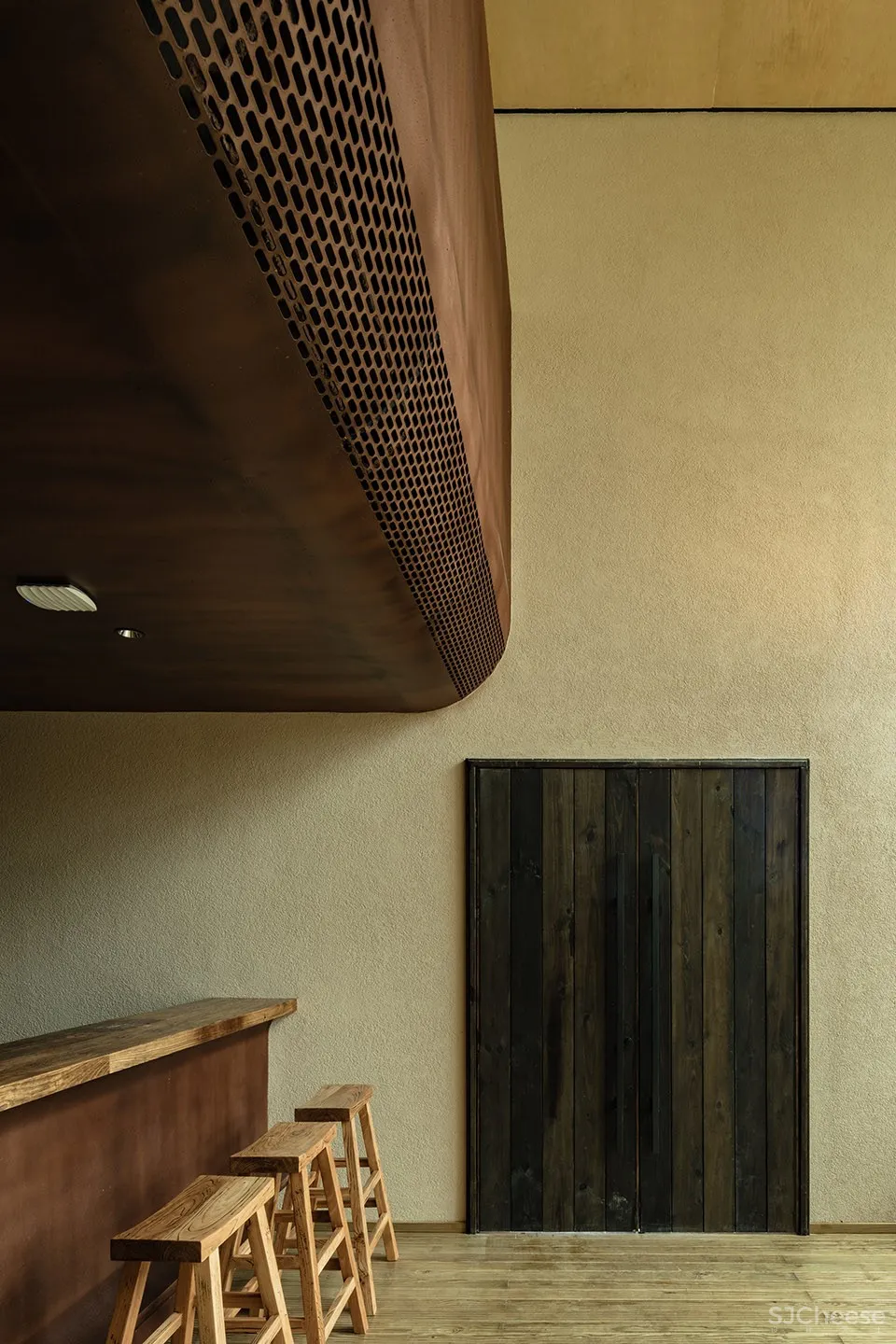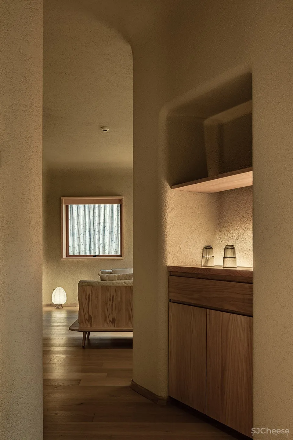 村庄地处山间,夜晚没有来自周围环境的灯光,即便是最小的照度也能充分的感受到亮度。因此,我们将能大面积照亮整个空间的照明(例如筒灯)控制为最少,尽量采用质地柔软的伞形照明(例如落地灯和台灯)。它们将无缝的墙面和天花材料和弧形转角照亮,柔和的光线和阴影包裹着整个房间,更增加了空间的温度与舒适感。