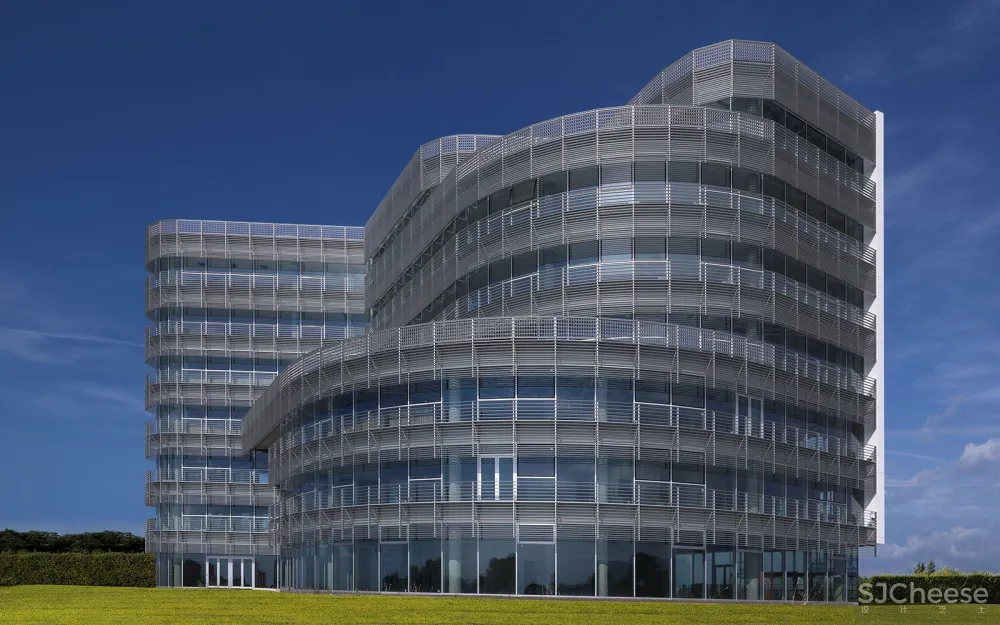 建筑局部,水平向的遮阳系统在提供畅通无阻的视线的同时进行了阳光的保护,partial exterior view, the horizontal sunscreen system allows free sights and sun protection simultaneously