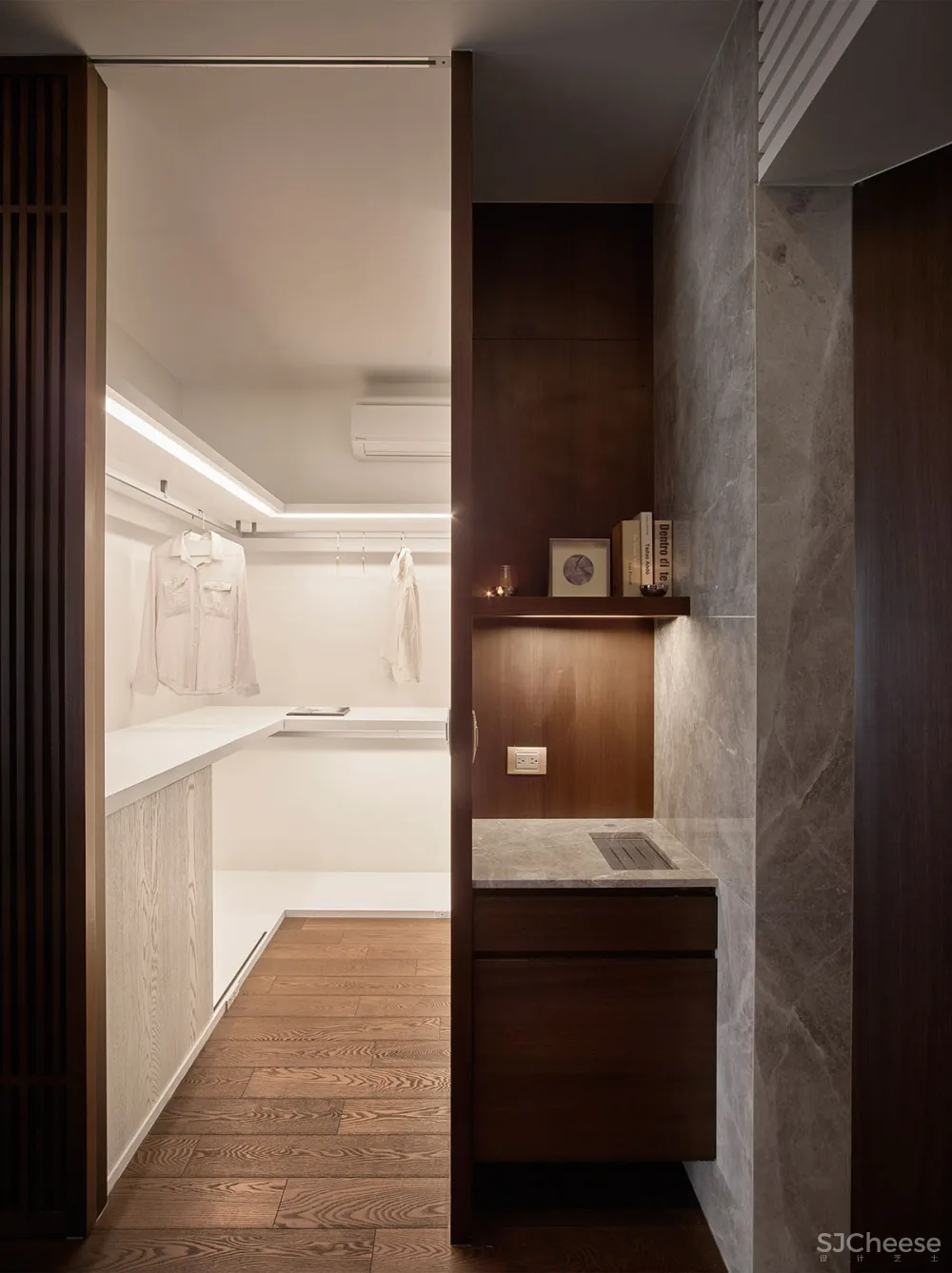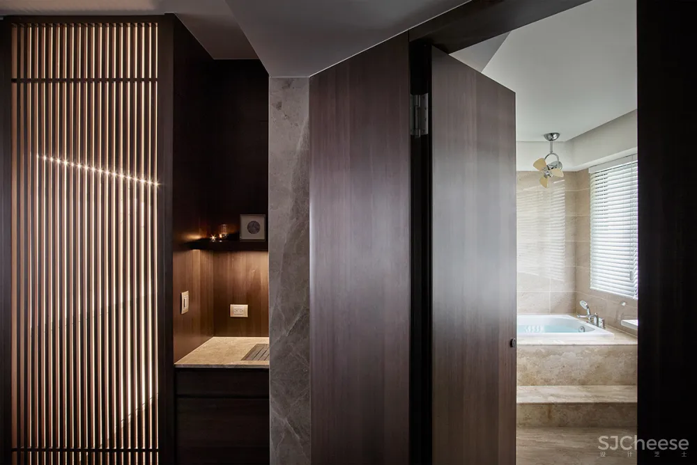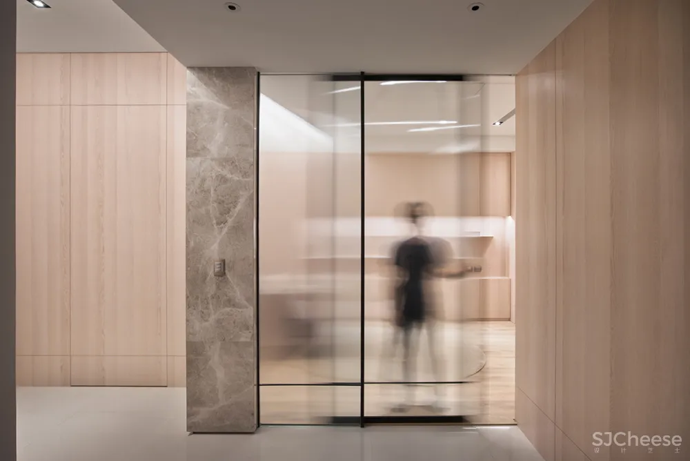 光与影在风和水中都是不拘一格的模糊和抽象,35度的斜线、80度的饱和也是如此,格栅的运用布局了透视的空间,可以灵活地穿梭视线,刻意的制造若隐若现的呈现,其中材质上保留中国白玉的色泽,对比冲突现代的设计表现,添加是为了表达一种回归原始的物质感,自然会带来新时代的生活透明感。
