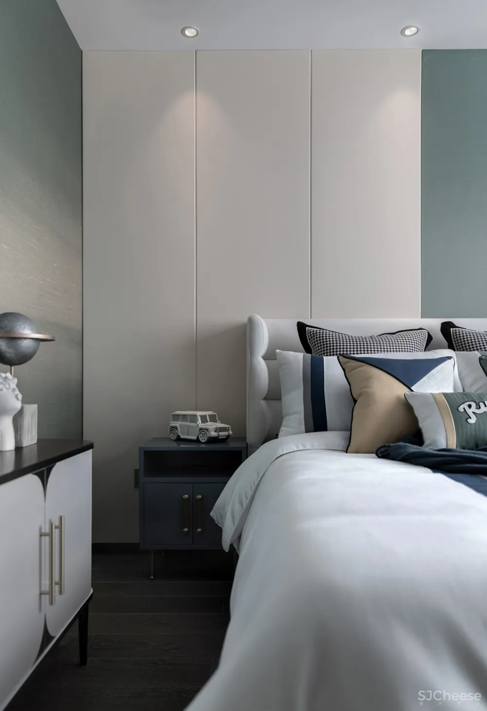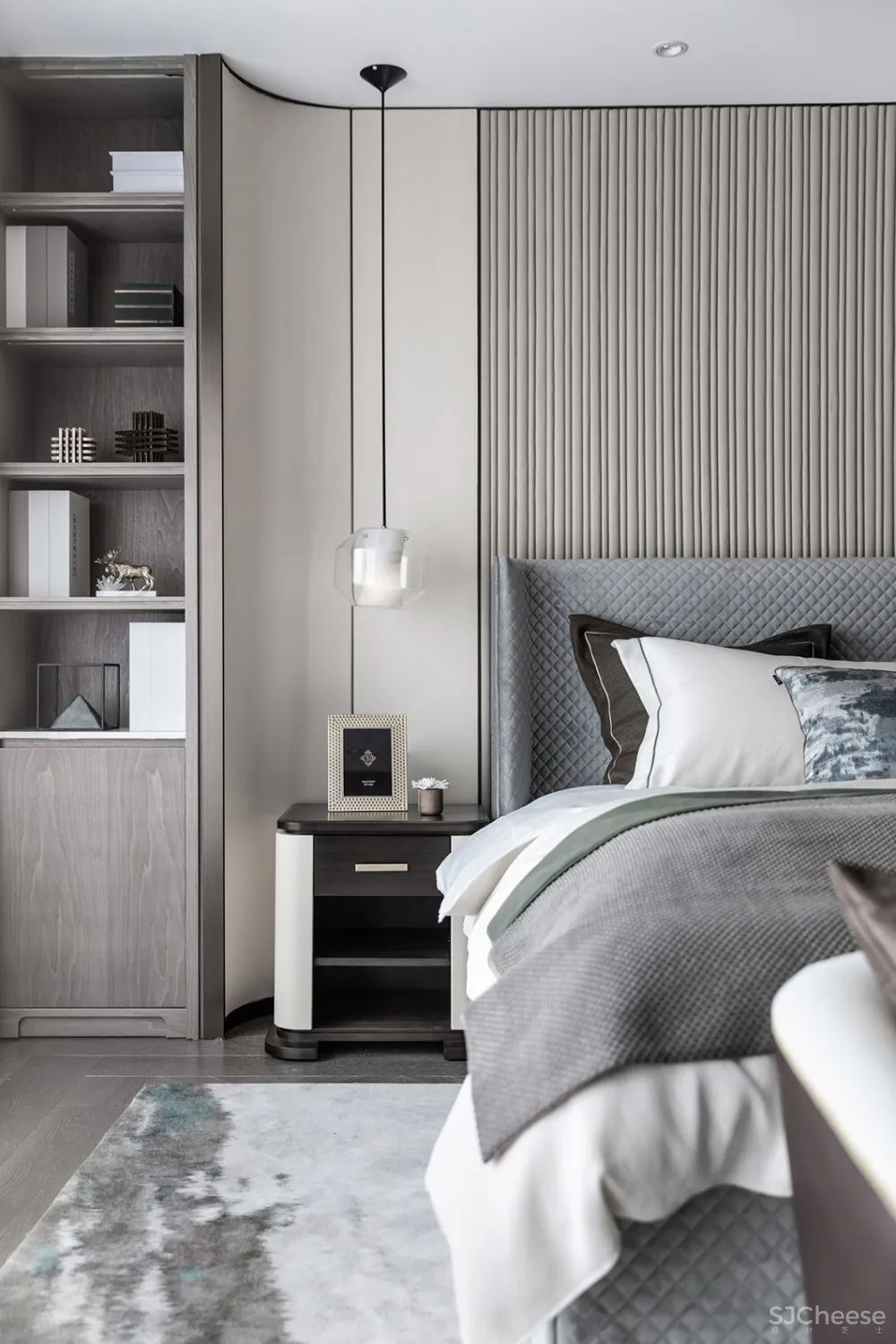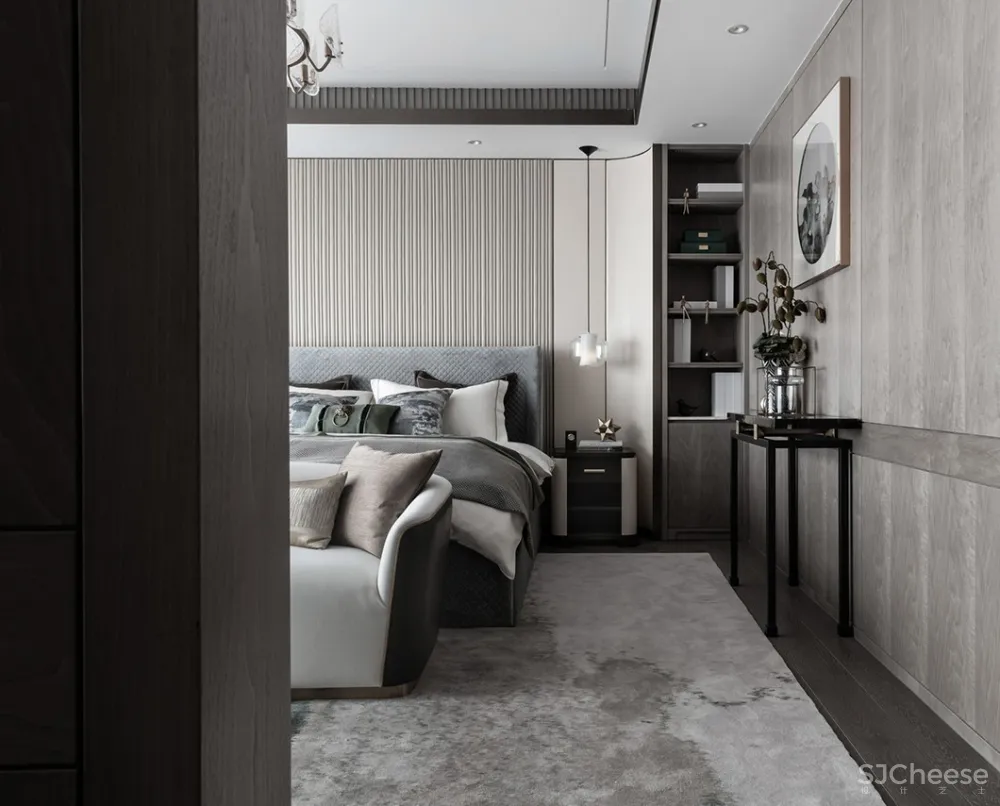 主卧的摆设颇费心思,几何元素的现代,搭配米色、棕色的沉稳,皮与布的结合碰撞出高级质感。更多平常的日子就如同配色本身一样朴实无华,如同岁月一样不露声色,只守着一份心的宁静和知足。