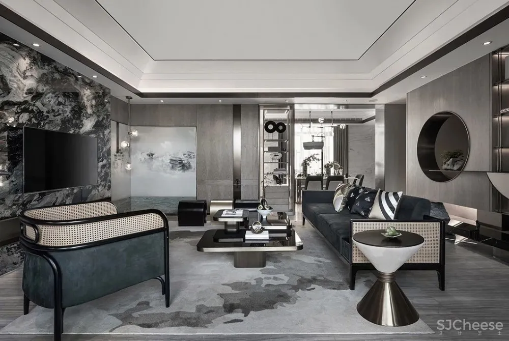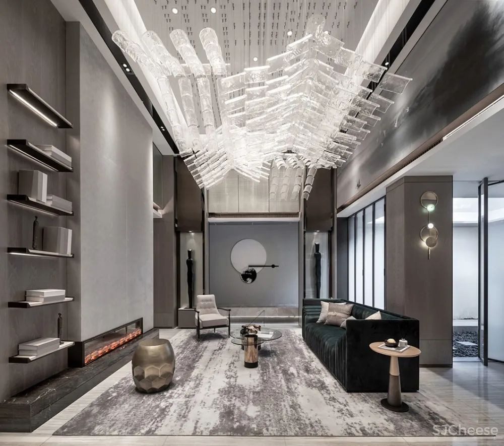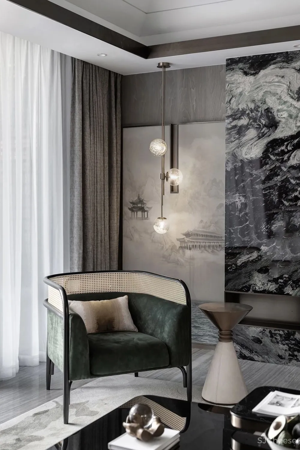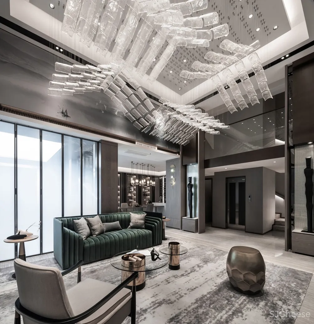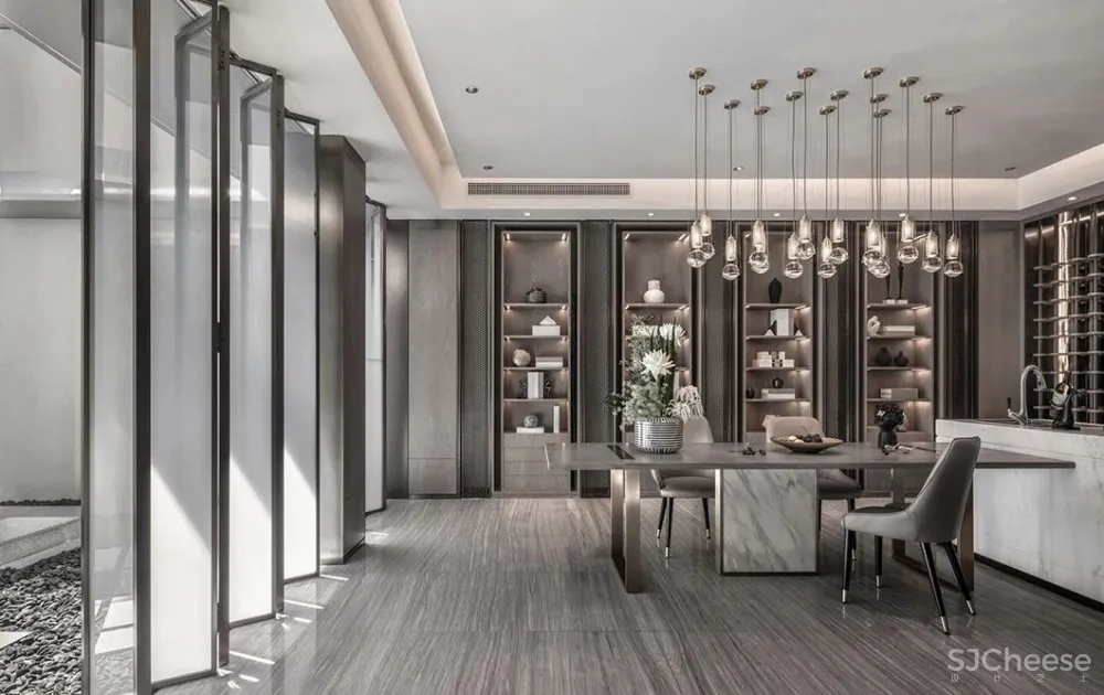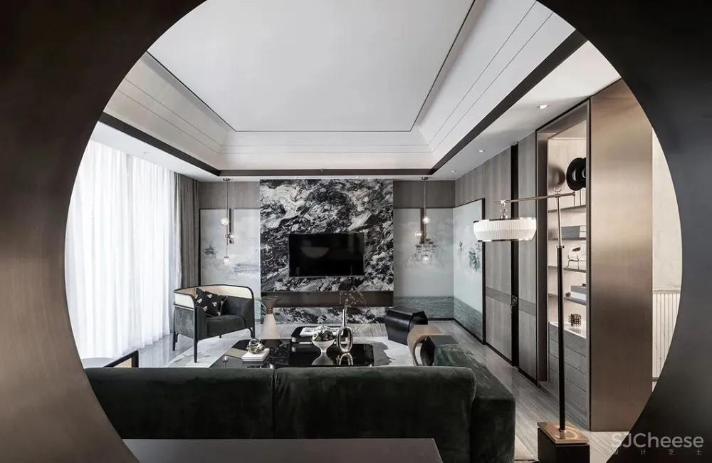秋窗日午,小厅无人。灰白与墨绿穿映于其中,加上金属元素的默契融合,辅以大理石墙与山水画墙布,雅致周到,极度契合主人对高端的追求,以及对中国传统文化的缕缕欢喜。透露出的是高雅的品味与独到的审美。