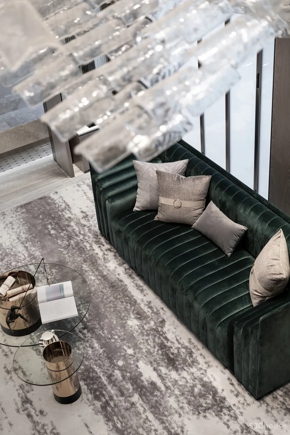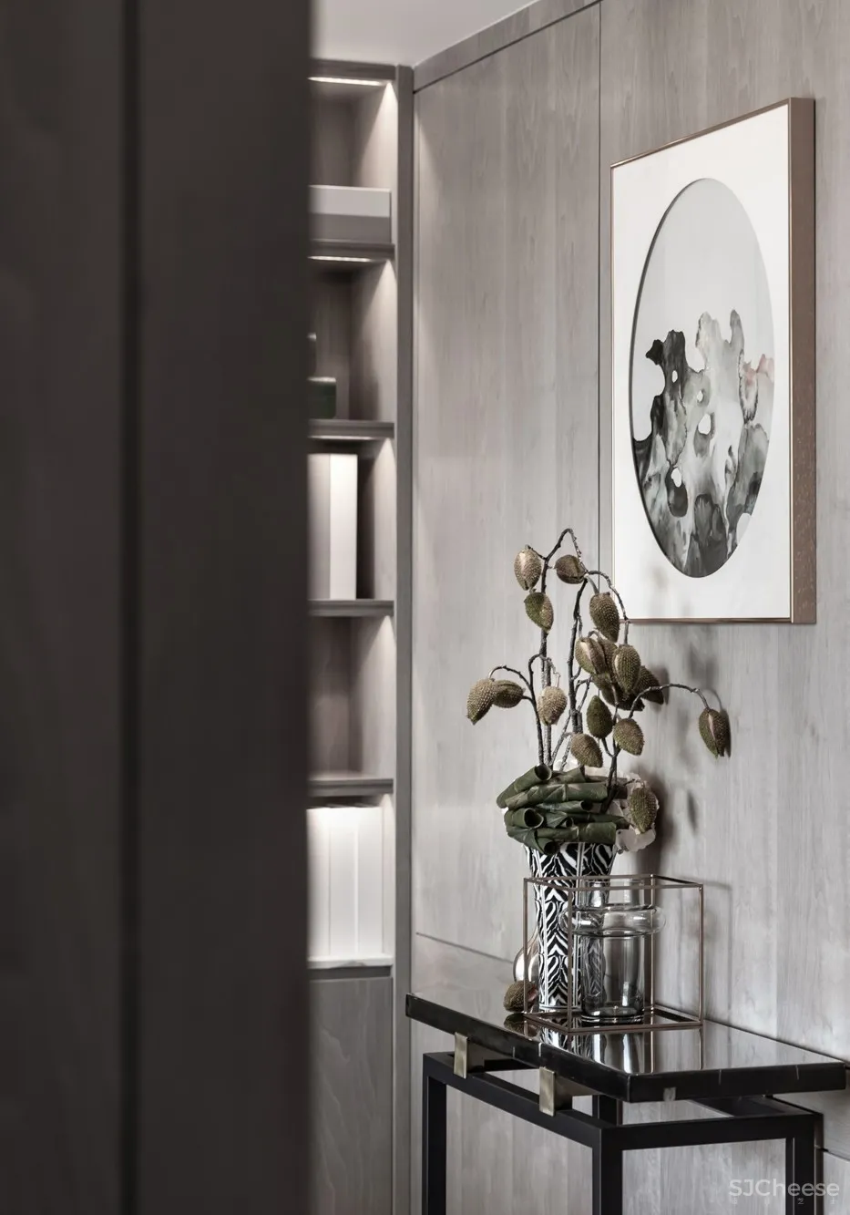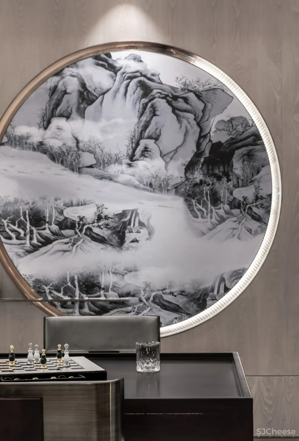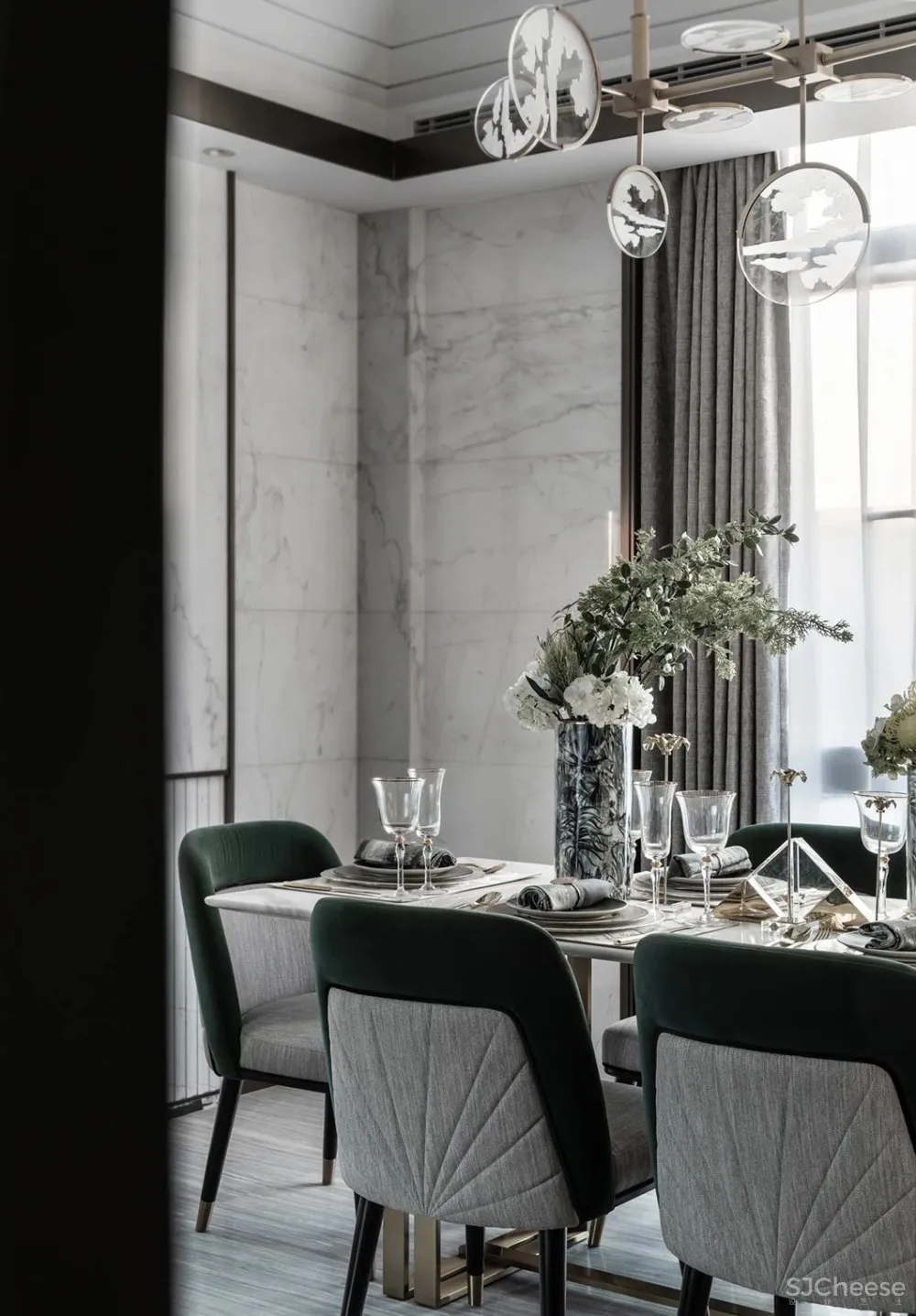 秋窗日午,小厅无人。灰白与墨绿穿映于其中,加上金属元素的默契融合,辅以大理石墙与山水画墙布,雅致周到,极度契合主人对高端的追求,以及对中国传统文化的缕缕欢喜。透露出的是高雅的品味与独到的审美。