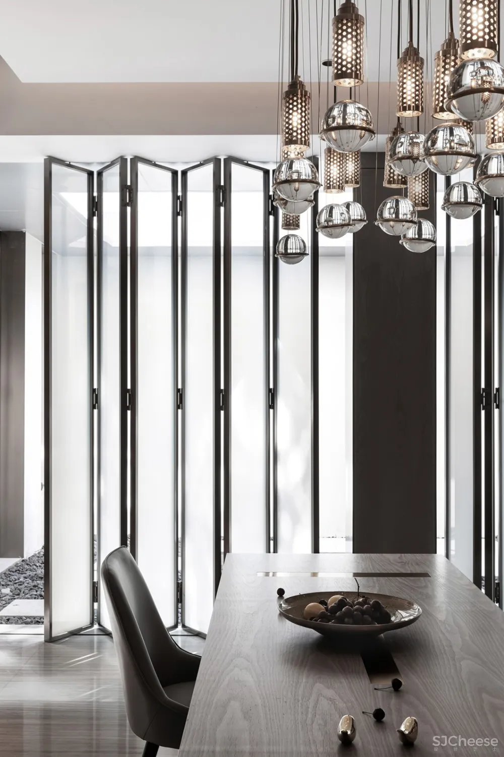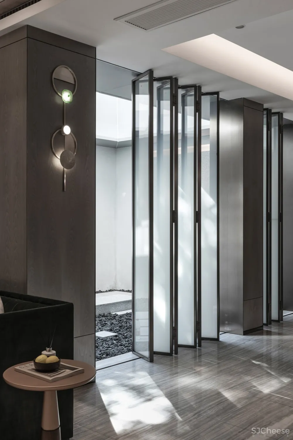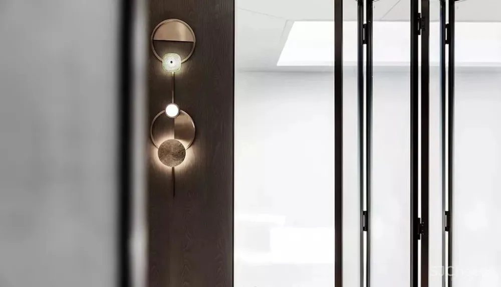 清光从折叠玻璃门中洒然而下,为地下空间投入参差斑驳的阴影,亦带来明丽的光亮,隐隐透着不规则的朦胧感,静影成壁,令人沉醉。