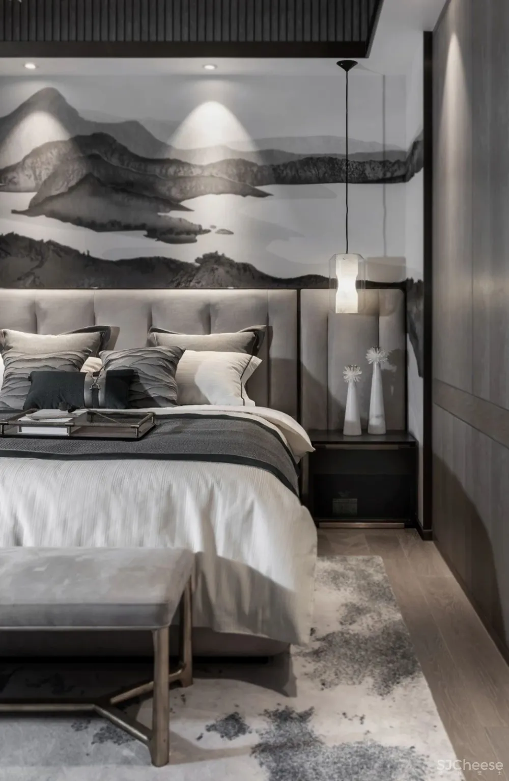 床头之上是灰黯色的山,你似觉压抑之时,它又仿佛会变成如纱的轻烟,如酥的小雨,让你不得不钦佩于水墨的魅力。“静默中自有广阔天地,在有限中也能宁静致远”的力量,赫然呈现。古中国的风韵,经过了一个个空间的流转,终于抵达。