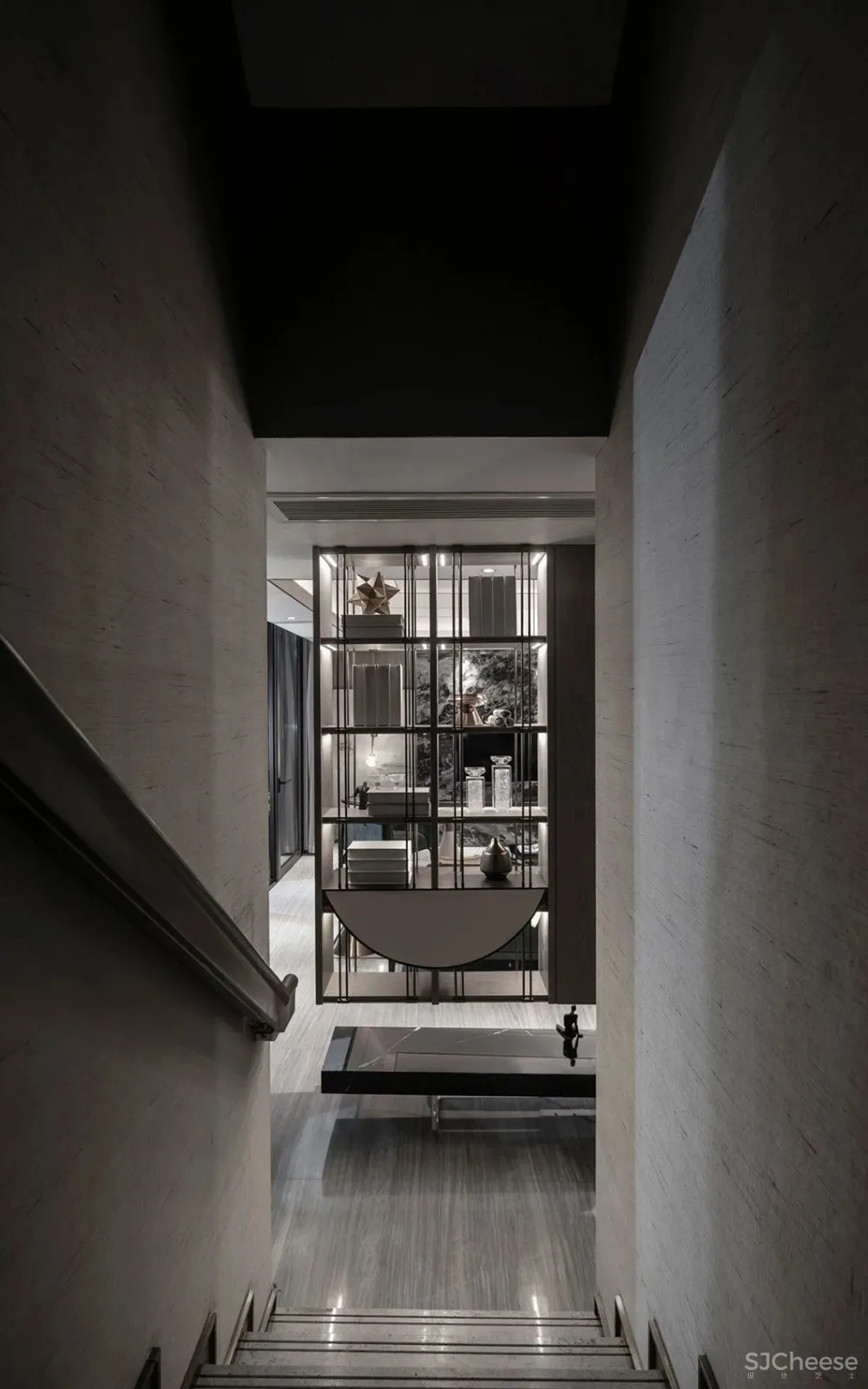 幽径移转,廊引人随,柳暗花明。大理石阶梯引领着我们,找寻地平线之下的崭新世界。移步换境,豁然开朗,精致摆设宛然如画,静中生趣。地下室,不再是传统储物的空间,而恰似一几一椅一榻的雅舍。