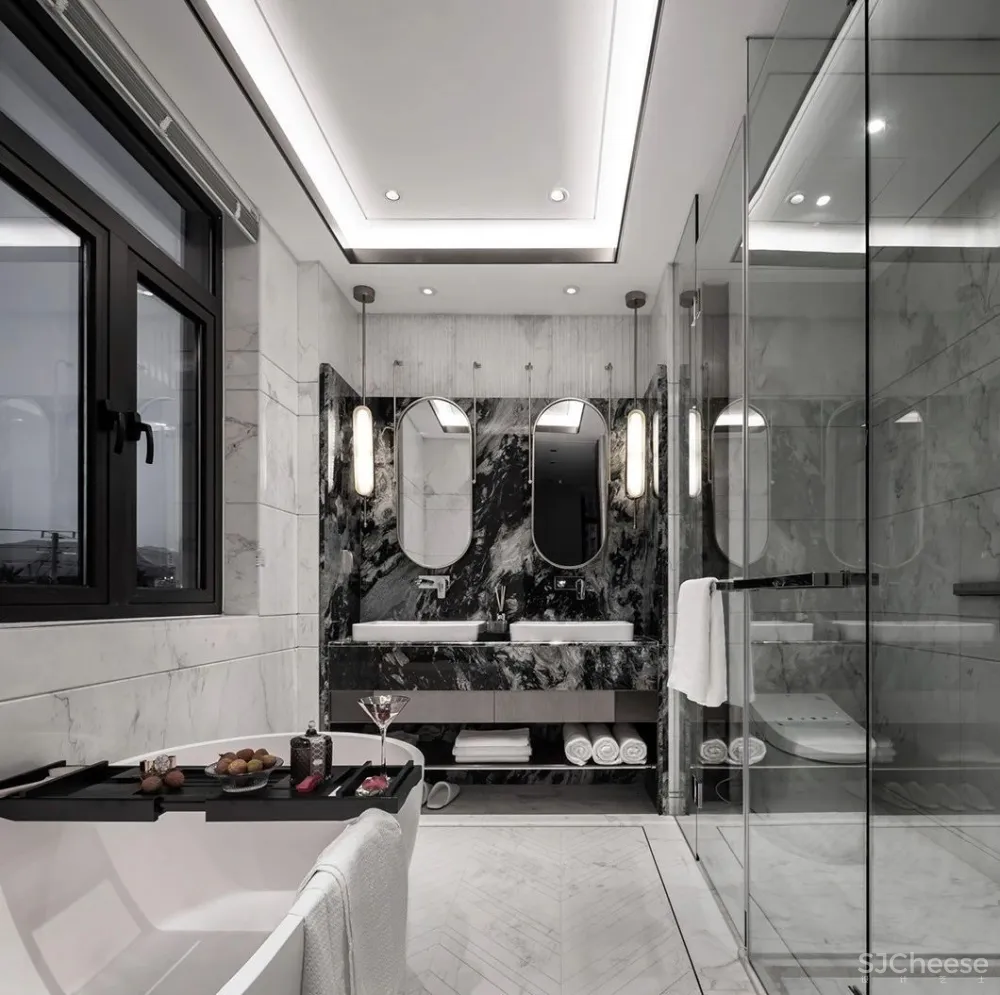 清透、明亮,黑白大理石的撞色搭配,将整个空间装点得恰到好处。清晨或是傍晚,唰唰水流,伴着朝阳或是霞光,像是生命,顺流直下。