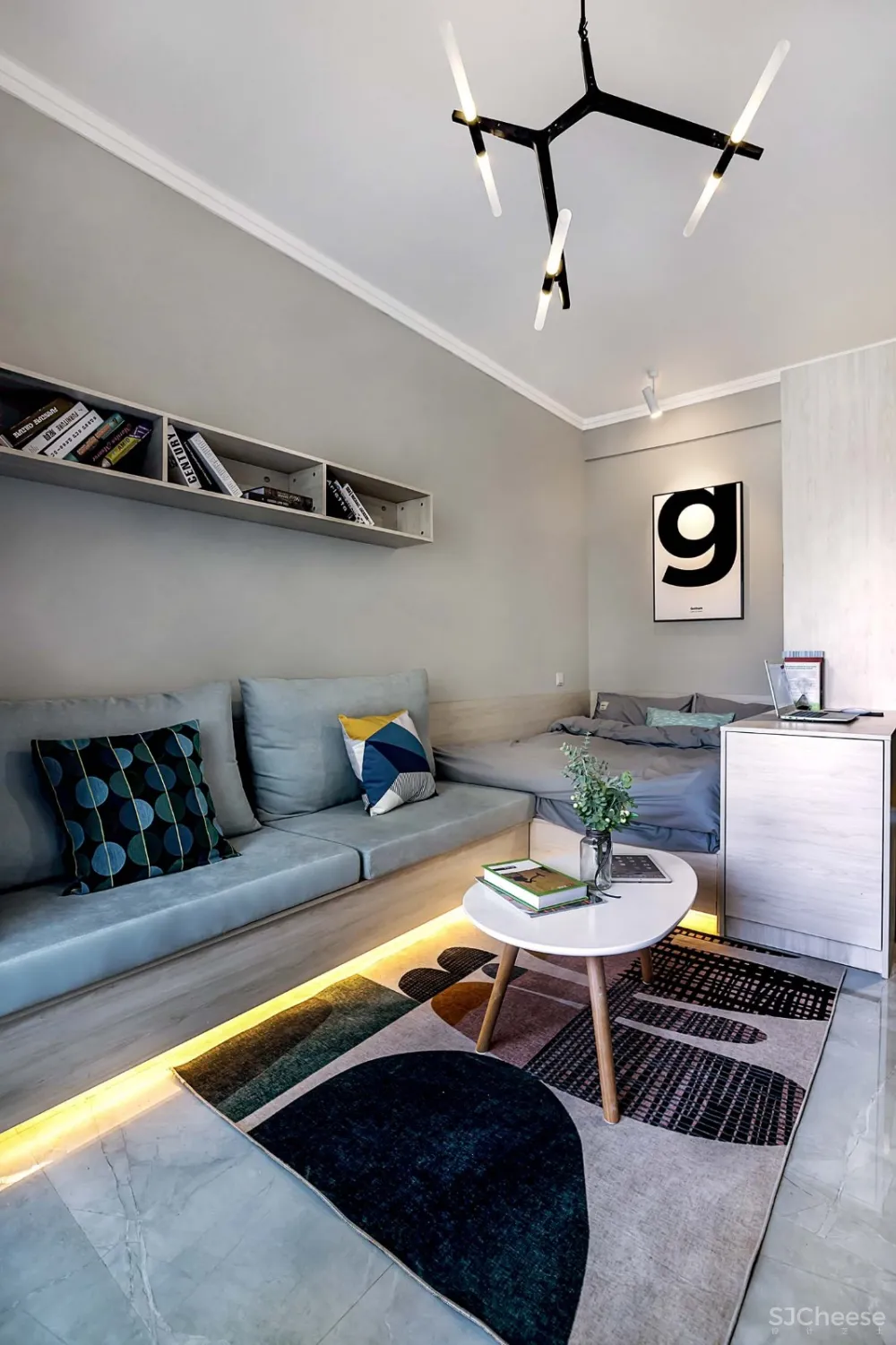 客厅和卧室被整合在一起,通过沙发靠背的隔档相互联系而又彼此独立,租客的动线也可以深入空间而不被家具阻隔,同时给床铺私密提供安全感。沙发及床下都具备收纳储物功能,打破呆板的空间感受。为运营及租客都提供了非常规使用体验。
