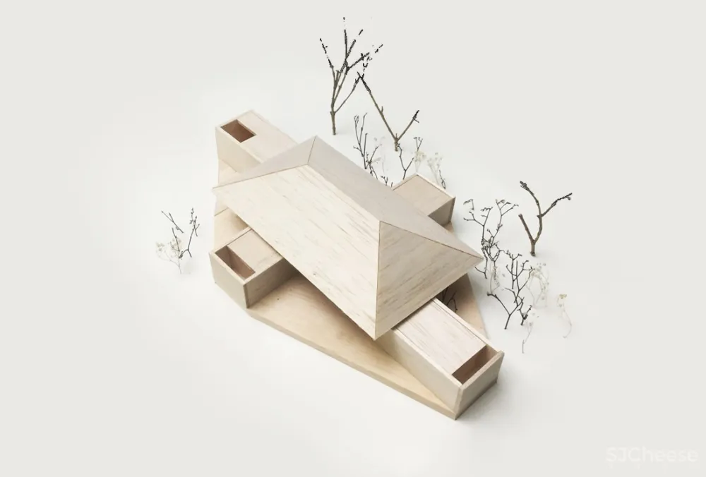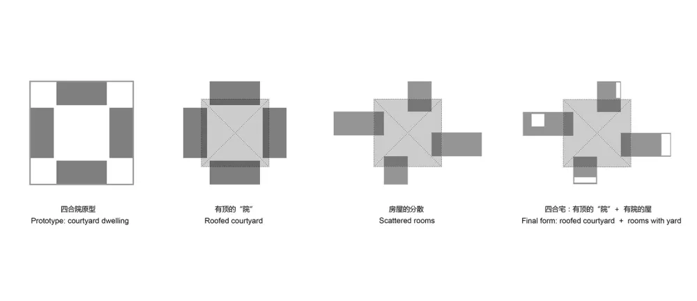 设计概念源自传统居住空间原型——四合院。四合院是一种内向型的建筑,由四向房屋围合一个庭院。建筑外部是封闭的,进入内部则完全开放,这使得个体生活缺乏私密性。结合这个特定场地和度假休闲的使用条件,我们决定把四合院变型成为“四合宅”。