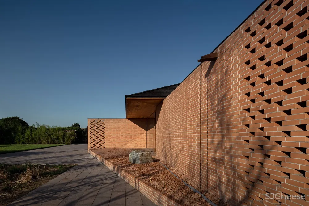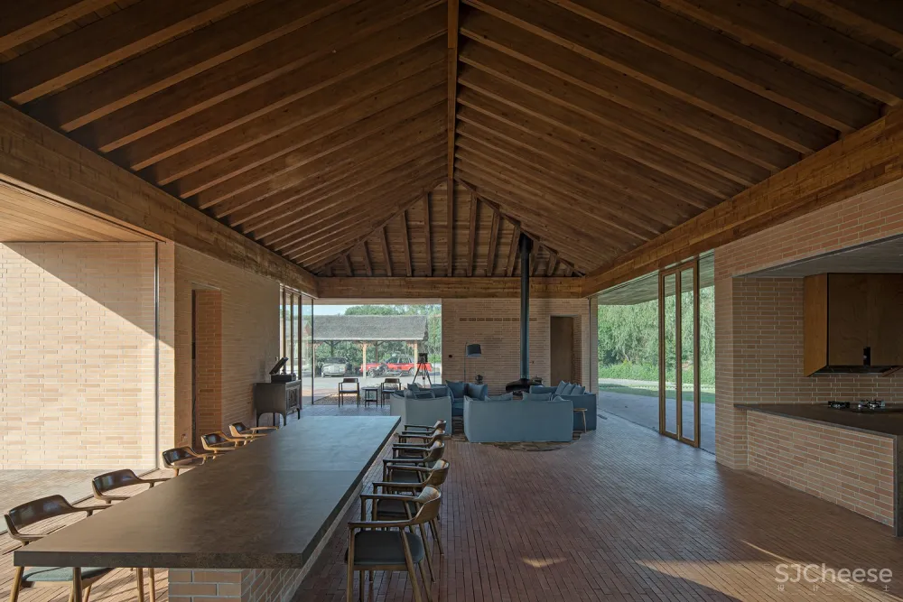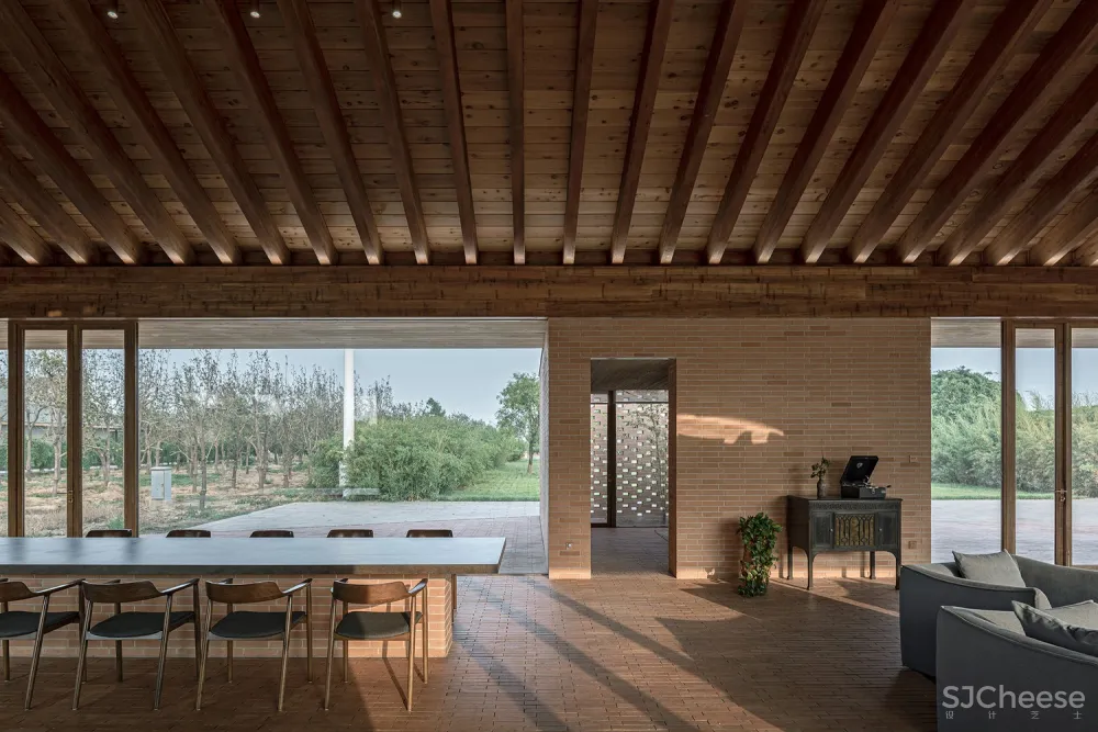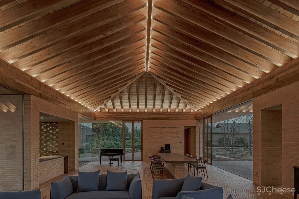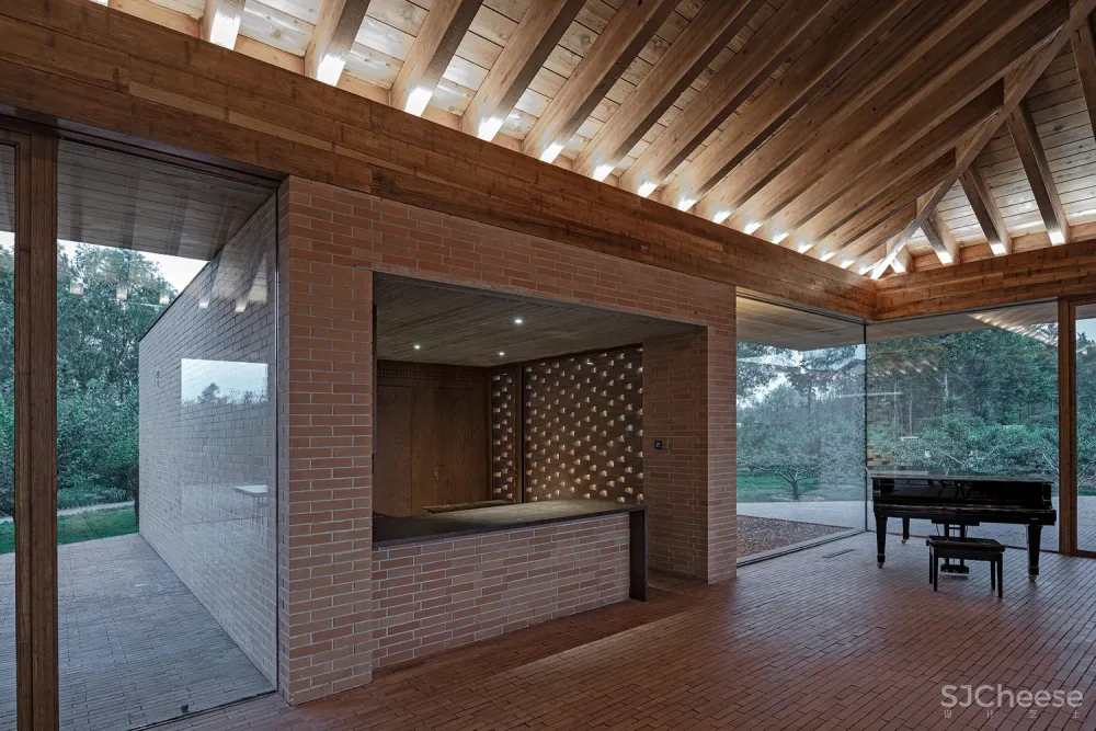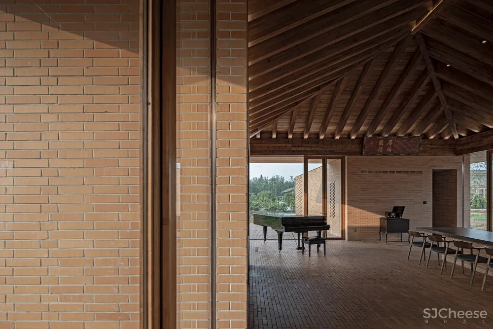 墙面在庭院部分由实砖渐变为漏砖,让房屋内外保持着光线和空气上的流通。室内外台基地面也全部由米黄色砖铺砌而成。公共空间屋顶采用了木结构密肋梁,屋面覆盖火烧板屋面瓦。木与砖材料的结合,共同营造出室内空间朴素、温暖、自然的氛围,并且由壁炉、餐台和钢琴进一步定义了不同公共活动区域。