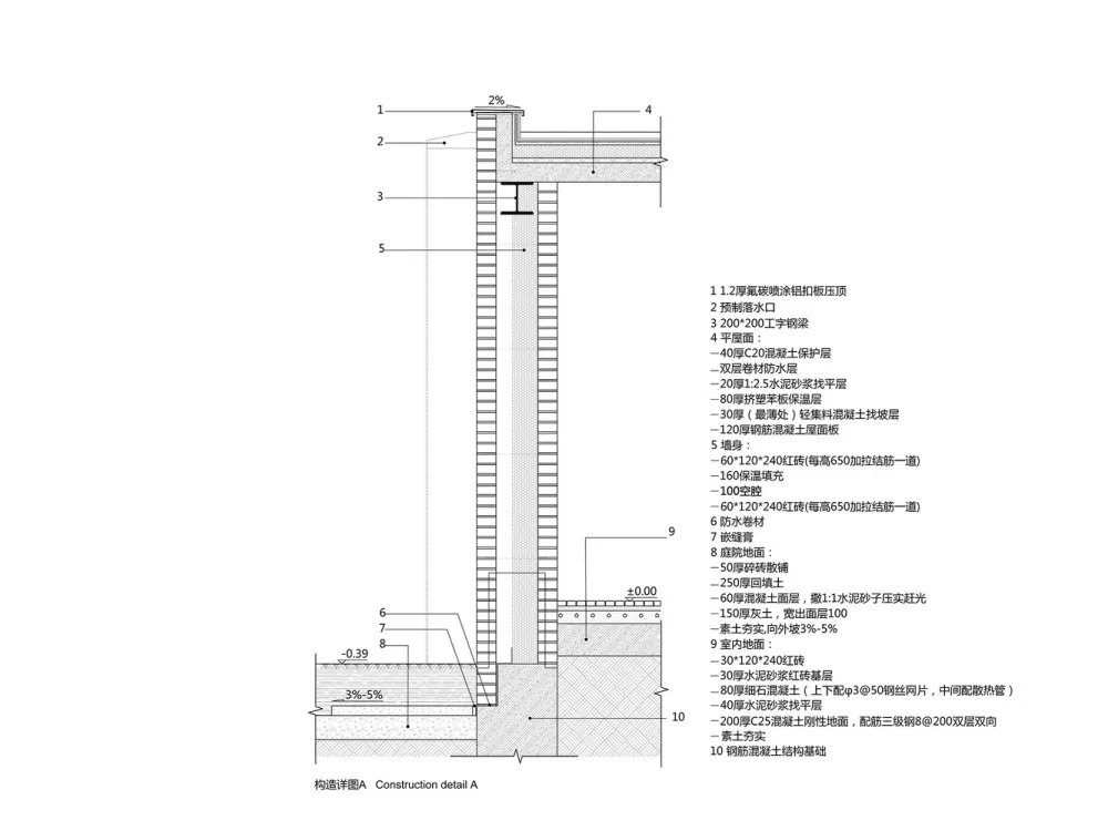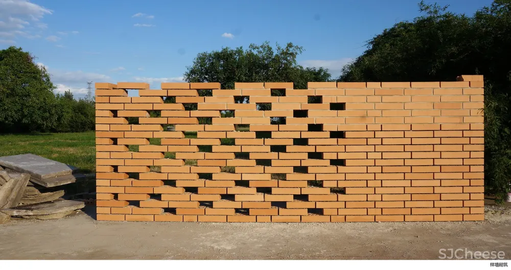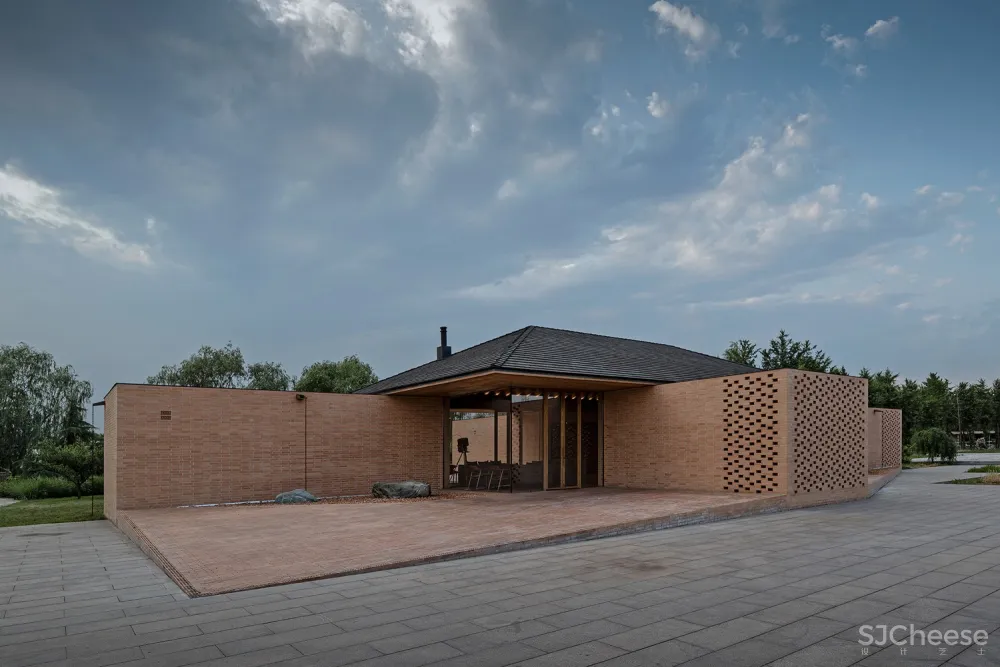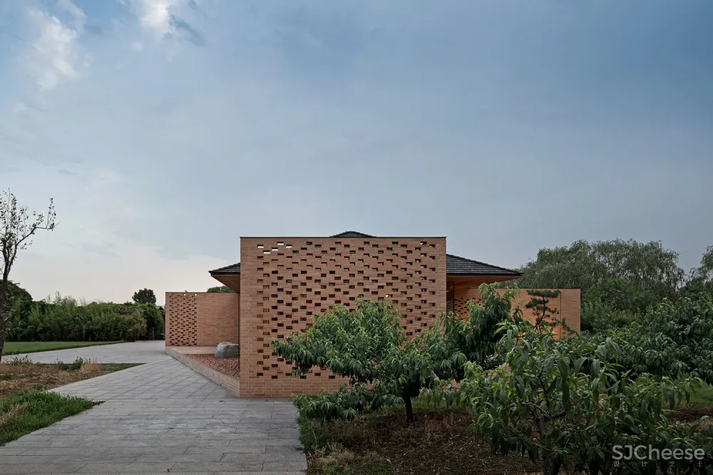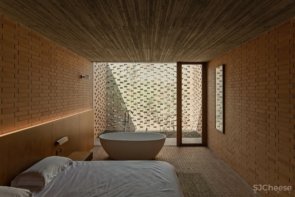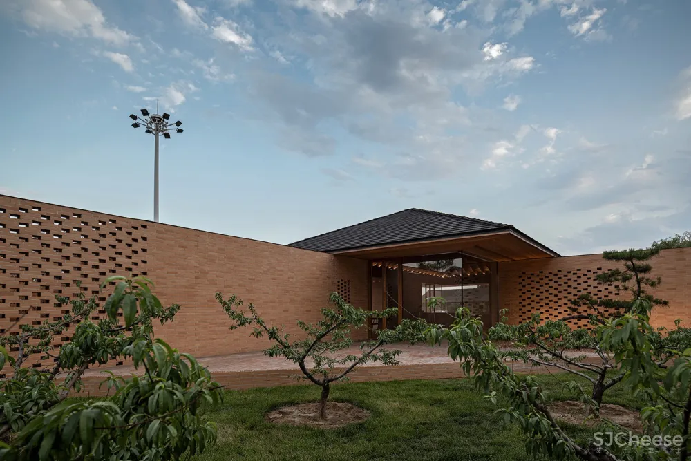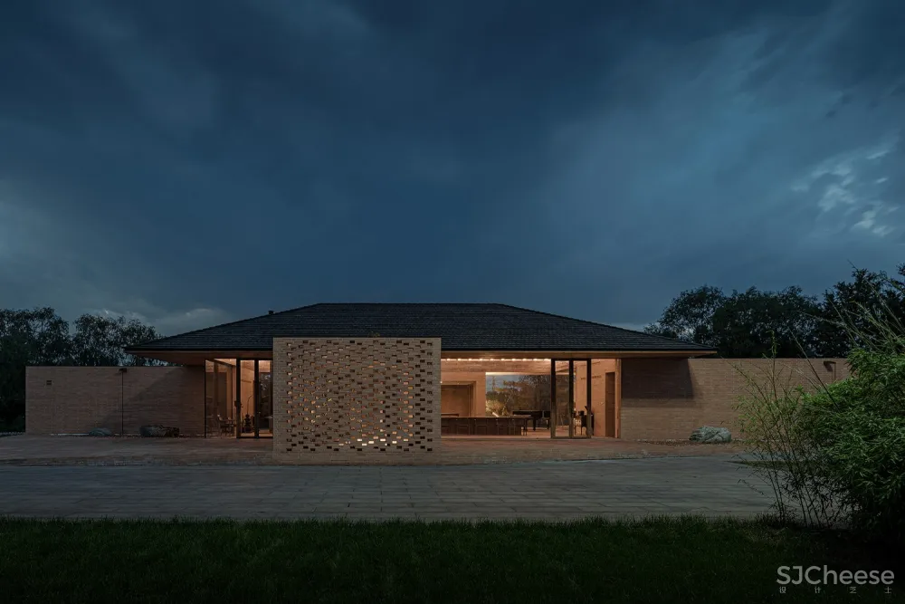 墙面在庭院部分由实砖渐变为漏砖,让房屋内外保持着光线和空气上的流通。室内外台基地面也全部由米黄色砖铺砌而成。公共空间屋顶采用了木结构密肋梁,屋面覆盖火烧板屋面瓦。木与砖材料的结合,共同营造出室内空间朴素、温暖、自然的氛围,并且由壁炉、餐台和钢琴进一步定义了不同公共活动区域。