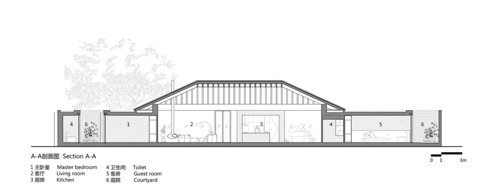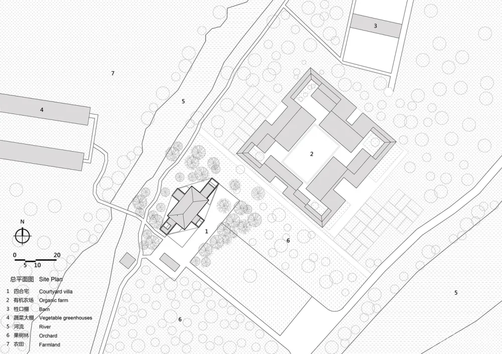 在保持四向房屋各自独立的条件下,将“院”置换为有顶的厅,将四面围合转变为四面开放,让厅堂与外部优美的风景互通共存,同时保证个体生活的私密性与接待活动的开放性各得其所。