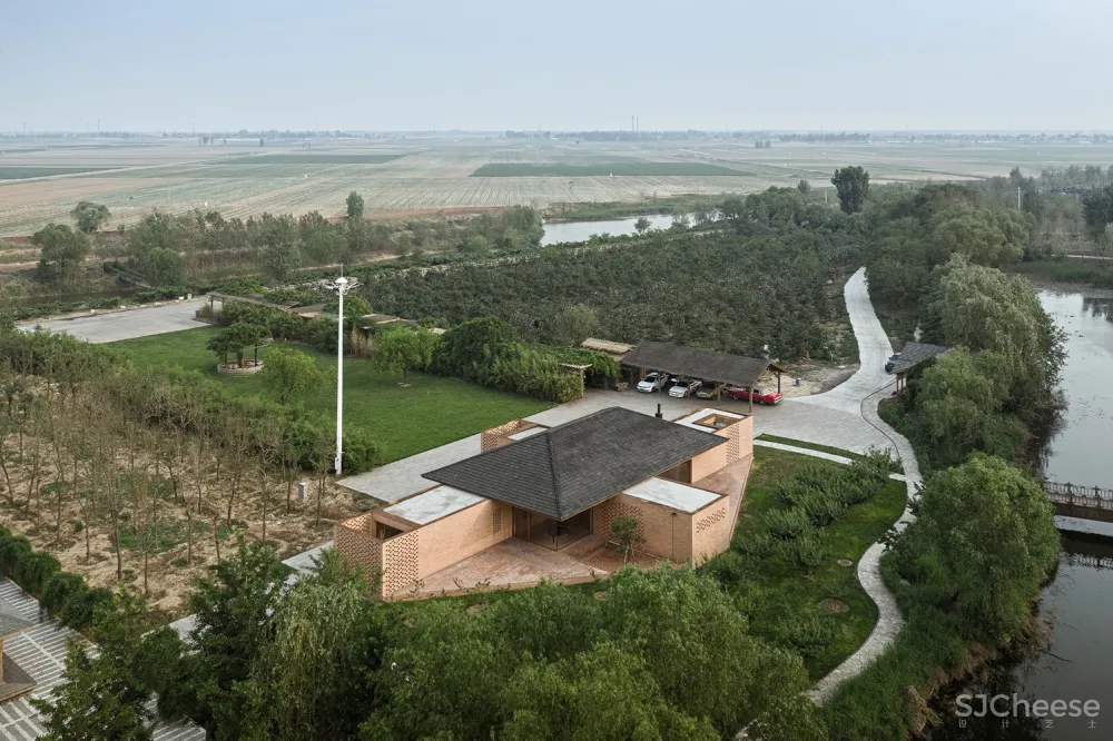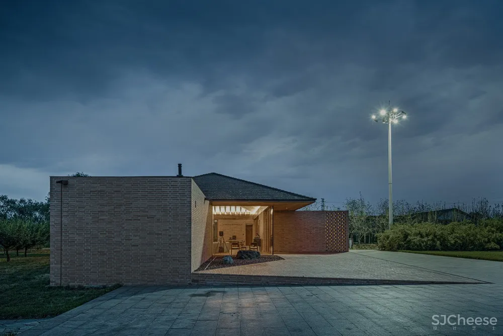 控制空间、结构与材料的逻辑关系,围绕乡村休闲空间的基本特征,呈现物料的本真之美。四间房屋采用钢框架+混凝土板,现浇木模板混凝土顶板直接显现于室内空间之内。墙面使用了一种米黄色页岩砖。设计利用双层清水砖墙构造,在墙内空腔设有保温层,保证热工性能的同时,也保持了内外一体的砖材料肌理和质感,并隐藏结构、空调等设备管线。