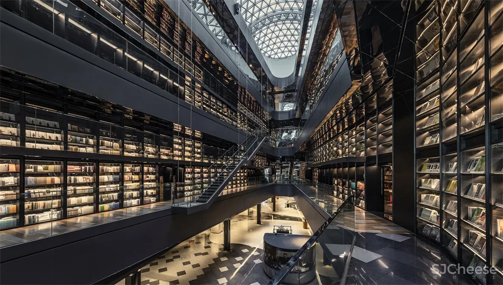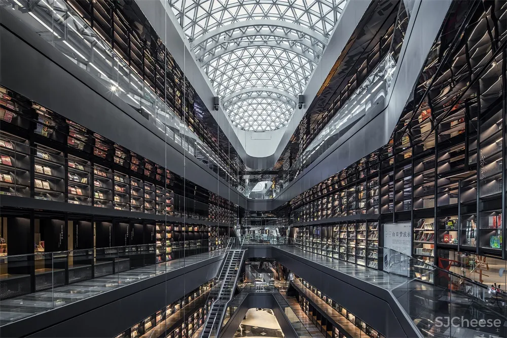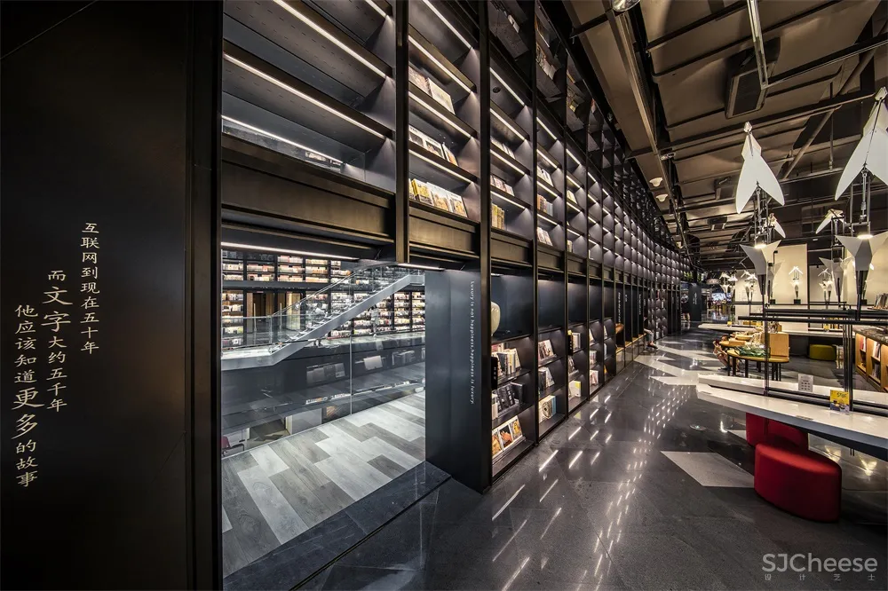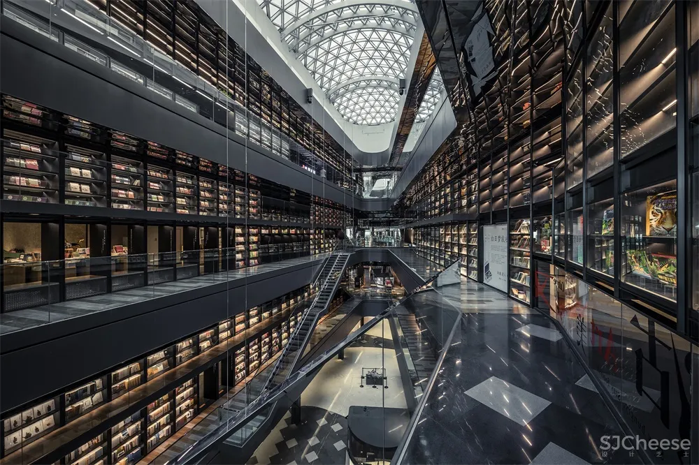 在主持设计师程瀚陞看来,要超越地域地段的限制,必须靠文化来使人汇集,因为文化本身没有距离,能够容纳全民参与进而实现最大引流。商场因此化身为以艺术与文学为核心的知识殿堂,将书的主题贯穿于整个空间。