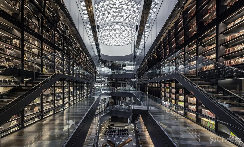 With hundreds of thousands of books placed in, the two large walls are constructed with steel structures and transparent glass, which enables people to see through and also allows the light randomly diffuse to the void area to interact with the spatial entities in various forms. Readers can walk between the book walls and void area, which becomes a unique scene in this hall.