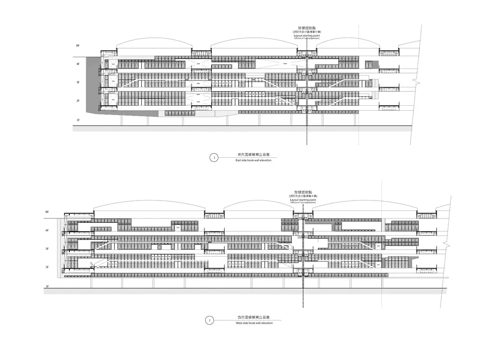 承载数十万册图书的书墙,以钢结构和透明玻璃为材质,除了视觉穿越,也让光线自由漫射在挑空区域,与空间实体交迭出各种形式的语汇。阅读者穿梭在书墙与挑空之间,成为这殿堂景象的一部分。
