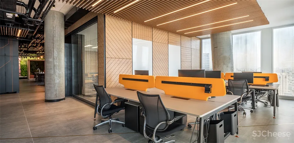 我们使用了木材、混凝土和钢材来反映该公司的身份和愿景。前台是办公室日常活动的中心,由三种材料混合而成,而其他部分则使用一种材料或多种材料的组合来表达一个既定的主题。