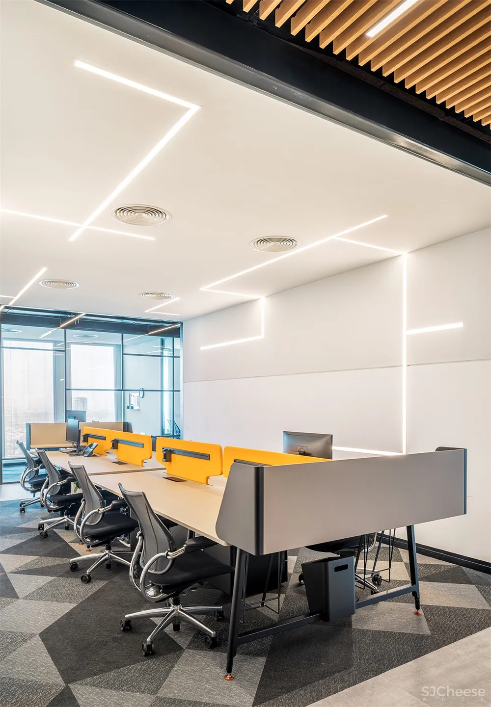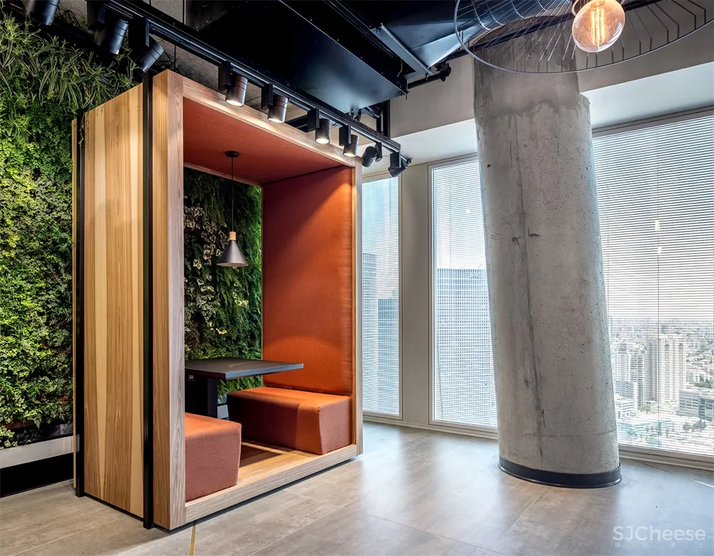 为了保持开放和流动的效果,使用玻璃墙将私人办公室与开放空间隔开。各种类型的小隔间——包括工作站和非正式的会议空间——在整个空间中创造出微妙的分隔。这种布局使整个办公室视野开阔。
