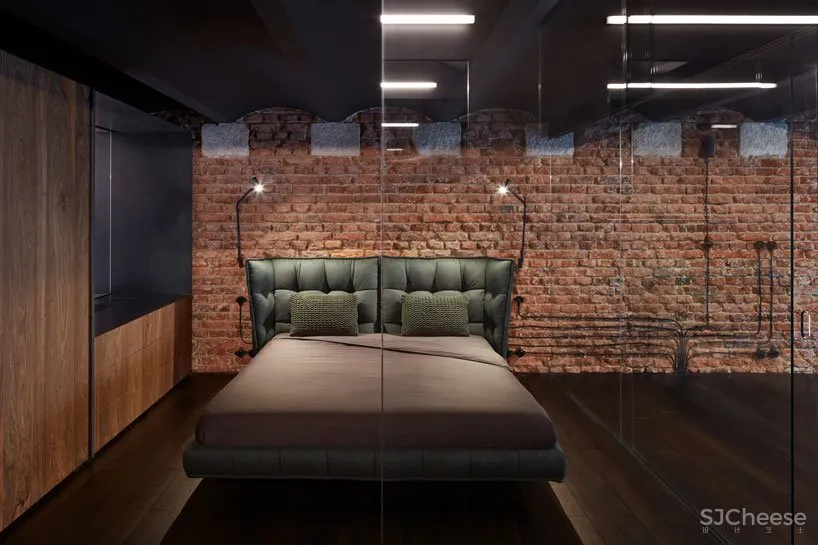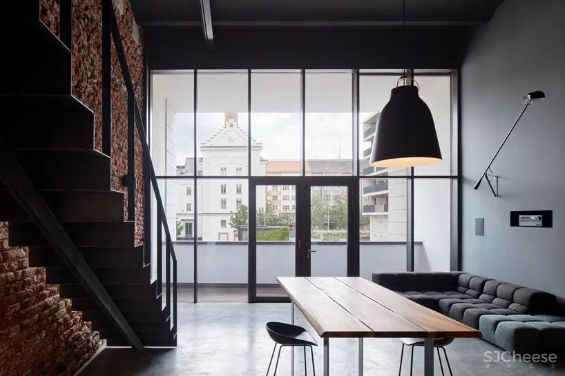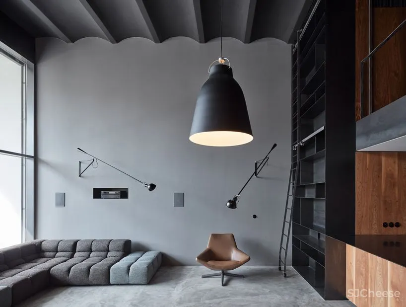 室内设计的特点是未粉刷的砖墙表面,钢制楼梯,钢制书柜,混凝土地板和以哑光黑色完成的桶形拱形天花板。设计团队旨在保护建筑的旧工业特色,并为现代生活创造一个舒适的生活空间。