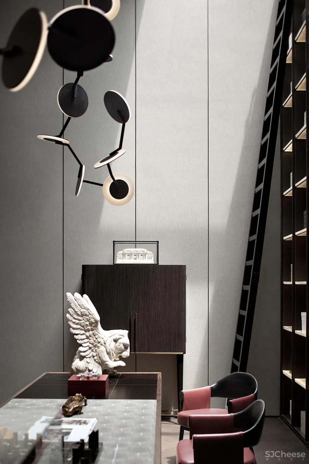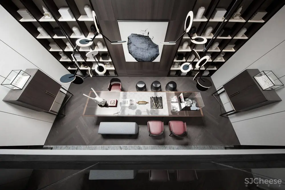 木质与黑钢构筑的挑空书架墙,以不可量度的气势贯通一层的客餐厅,成为最大的视觉停留点。书架背面为镂空的钢拉网,使得楼梯与客厅之间形成隐约的视觉互动。墙面及天花以精致的古铜色金属构件和木作造型艺术加以装饰,让整个空间更具时尚气息和柔性触感。