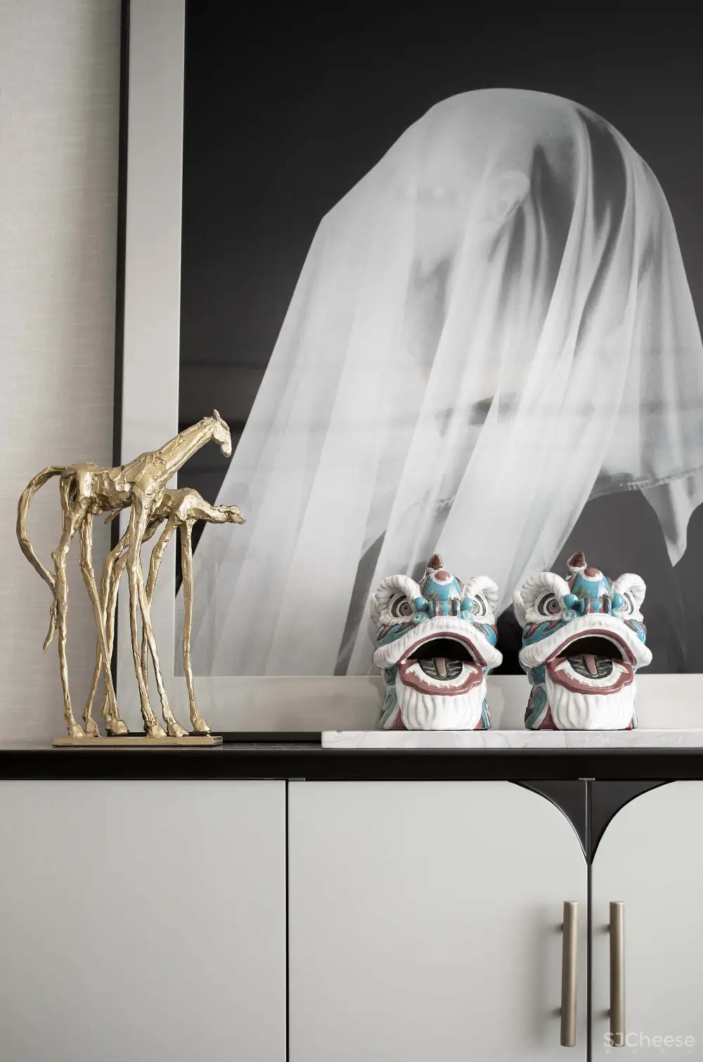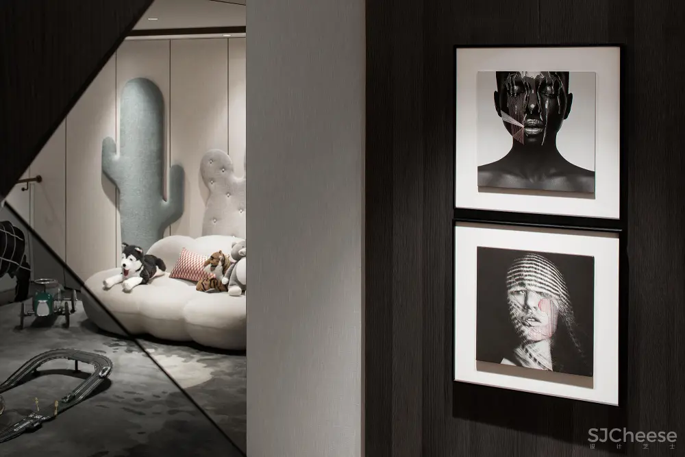 一幅幅极具视觉张力的装饰画作为线索,串联起卧室、客厅、夹层和地下室在内的整个空间叙事,既有抽象笔触勾勒的艺术提炼,也有影像式的写实还原。它们与其他陈设艺术藏品交叠排列,仿佛年轮循环反复,在未来的生活中留下时间的记忆。